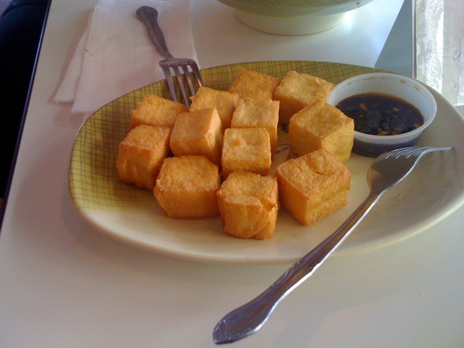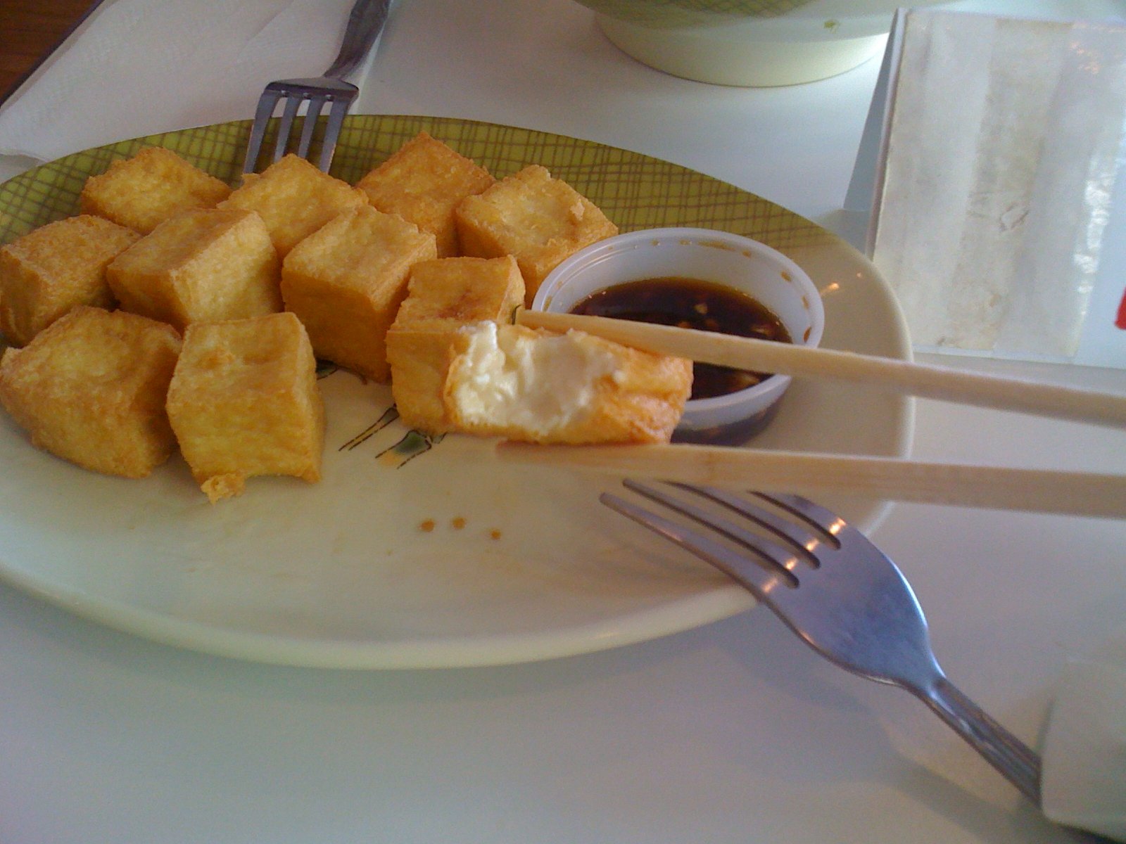 I wanted to try the fried tofu ($5.59). When this came, I thought it looked like a thick, hard crust and was almost disappointed.Instead, I was pleasantly surprised at the delicate thinness of the coating and soft, soft fresh tofu inside. The dipping sauce was a very dark soy and sesame oil base and filled with chopped garlic, green onion tops and some red pepper flakes. Extremely complimentary for the tofu, and just the right amount of heat. I think if I had ordered the salt and pepper fried tofu (50¢ more), this dipping sauce would have been overpowering.