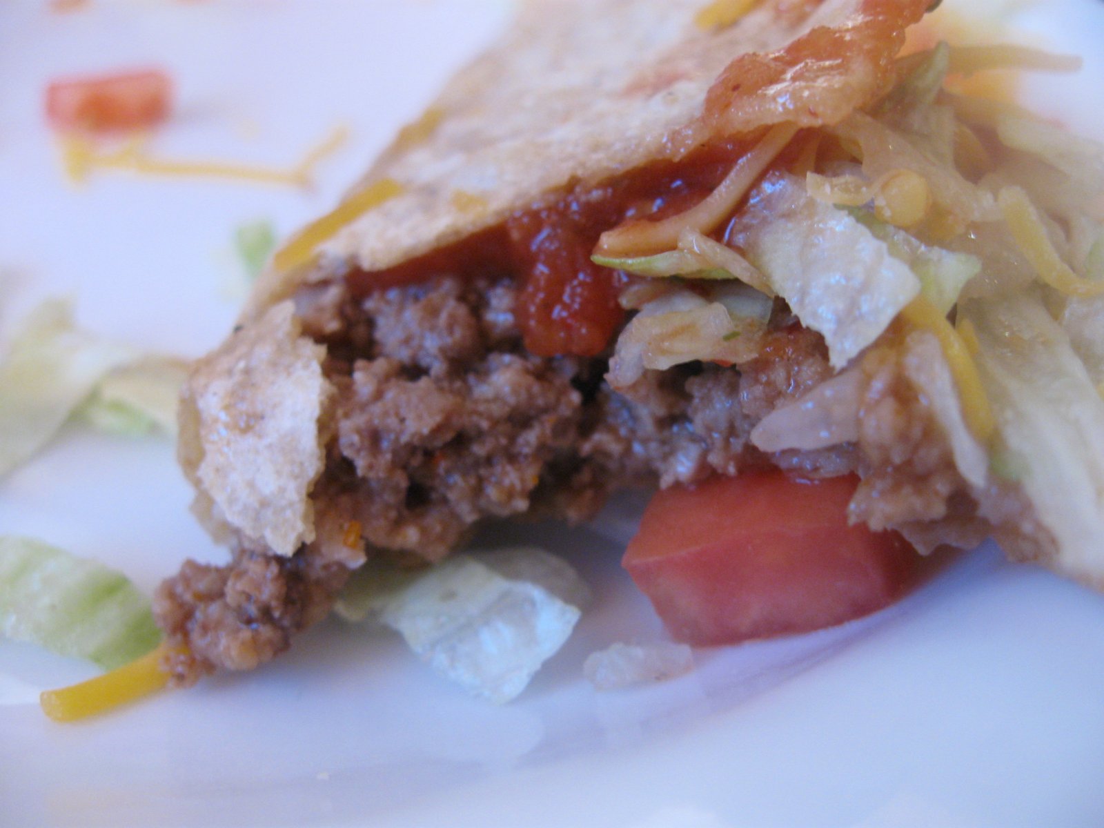 So this time, we ordered them, and they were perfect, better than my memories. Totally crisp and greaseless, the crunchy shells stayed intact even when we poured salsa into them and then bit off the end. The hamburger was moist and perfectly seasoned. There was just enough lettuce and yellow cheese. Ummmm-crunchy beefy good:
