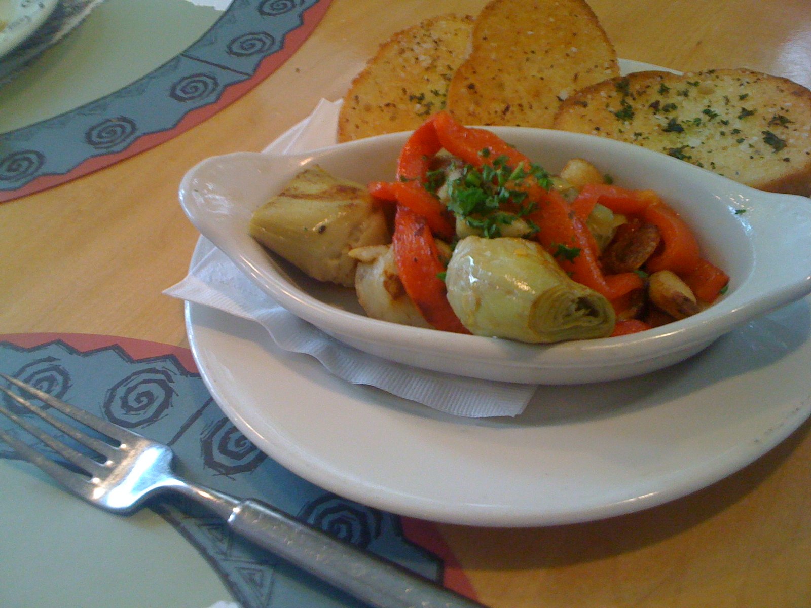 Soon, our artichoke heart appetizer ($7) arrived. Artichoke hearts, red pepper strips and garlic cloves which had been carmelized olive oil. Served with three crisp crostini. Very good.