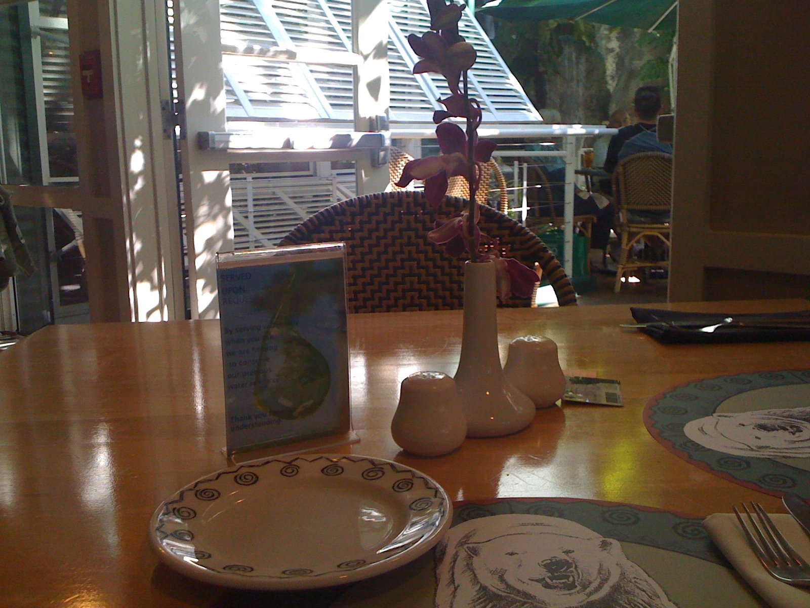 Then we walked on the Trail through the Lost Forest, passing the Gorilla Exhibit, following the signs to Albert's Restaurant (named after Albert, a silverback gorilla who came to the Zoo at 4 months of age, was hand raised and lived here for about 30 years and was the Patriarch of the Gorillas). The fanciest place to dine at the Zoo. Cloth napkin fancy. The only full service restaurant here. We had to wait a few minutes to be seated, as the restaurant had just opened and others were being seated.