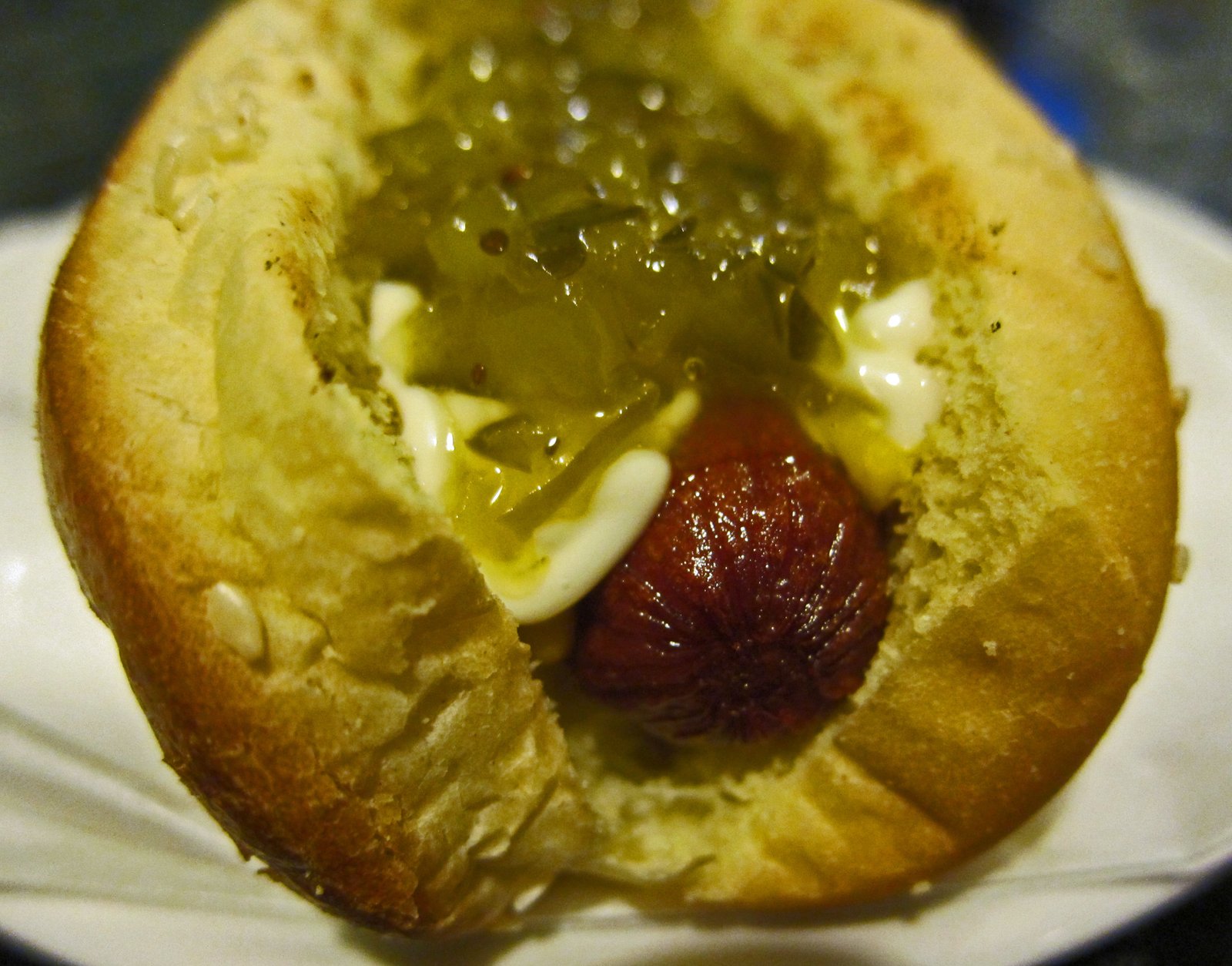 It really was a hot dog (all beef) that had been deep fried…… in this case topped with mayo-mustard-relish, in a sesame seed roll. Yes, just a hot dog…..really.