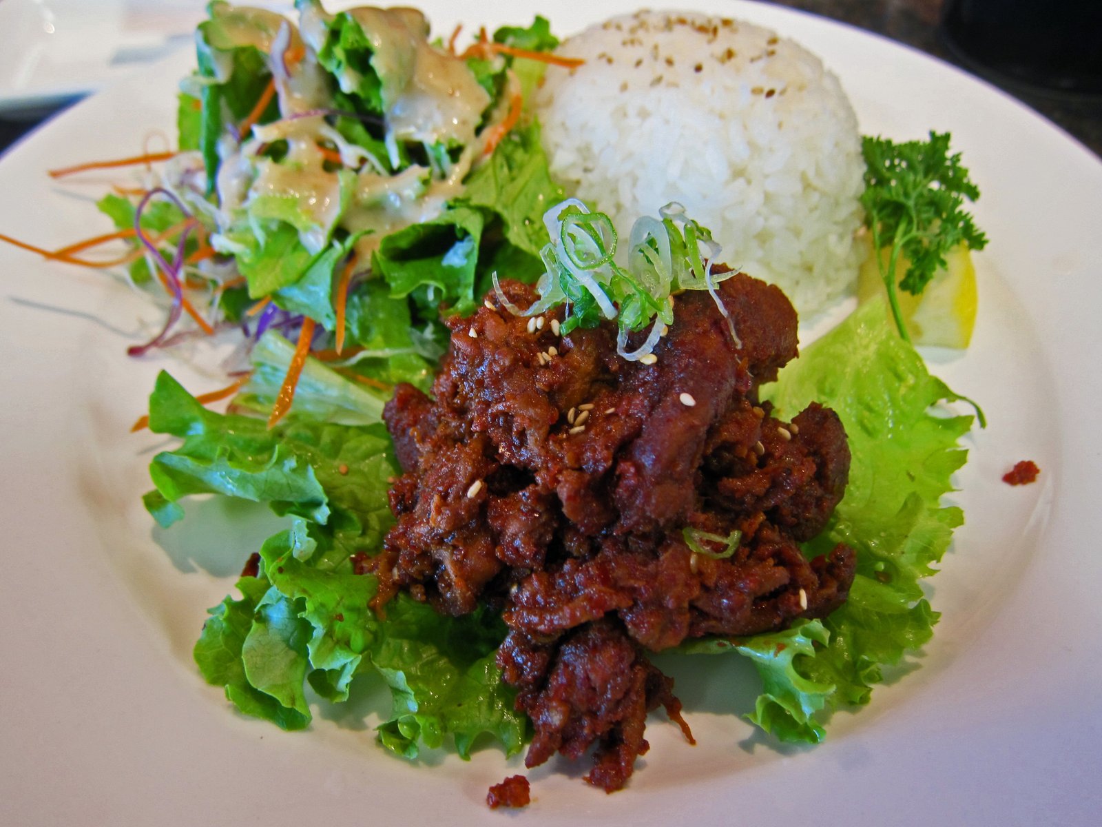 Scoop of rice, scoop of spicy pork, green salad; about the equivalent of a plate lunch stand's "mini plate"…. which I believe is closer to four buck nowadays…….