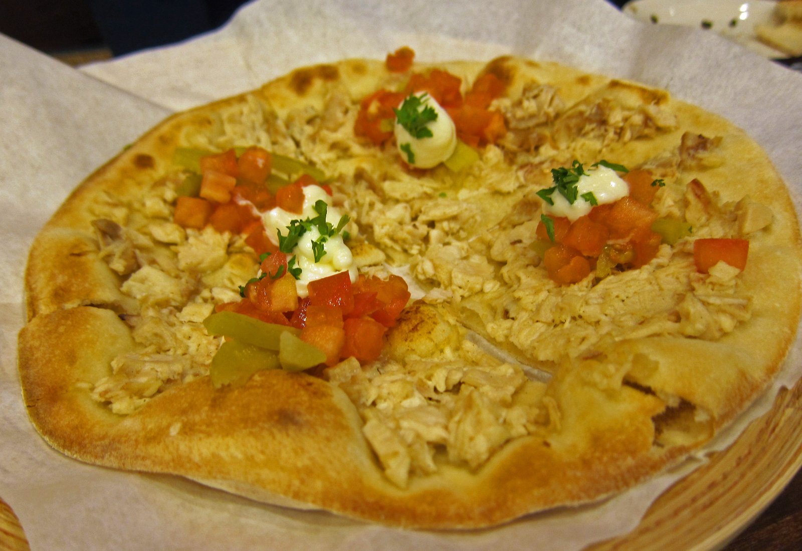 Looking like a simple white meat chicken topped flat bread, the chicken had been simply marinated and was very tasty. Of course being topped with the wonderful pickles and garlic paste (we of course added even more), this was very good. And to be perfectly honest, this was lighter, more refined, and had better prepared ingredients than what is served at Mama's. About this time George came around and told us that he prepares four different kinds of dough. And that the meat flat breads used a lighter dough, creating a thinner crust than the non-meat flat breads.