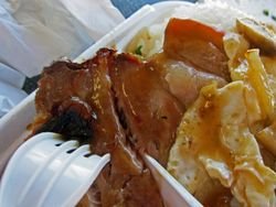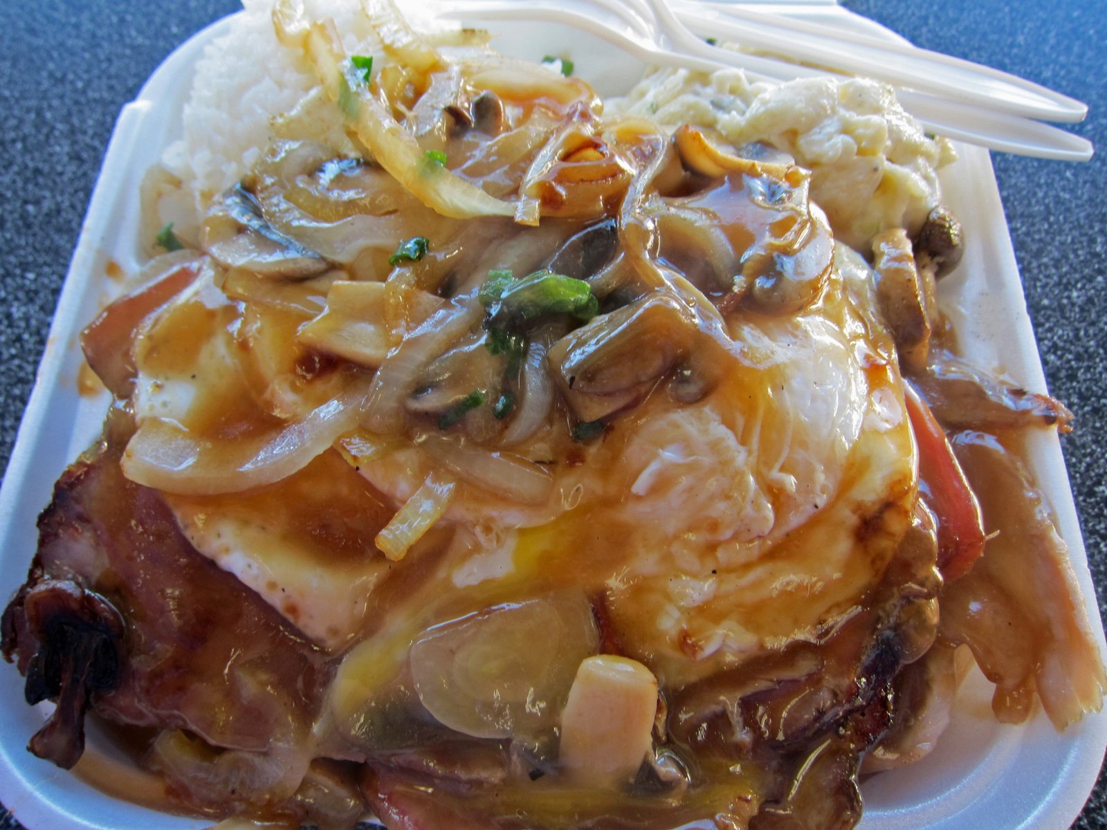 I'm not quite sure what to say other than…… this was an immense amount of food…. four large slices of roast pork, was enough for maybe three or four people in my opinion. The pork was moist, but I wished for more of the nicely flavored edges. This was too much of a good thing. I asked Mo if anyone had ever finished this, and he told me, "all the time!" You gotta remember that this has the equivalent of three scoops of rice (rice is hidden under the pork and gravy), and a scoop of Mac Salad. The gravy makes this version of the loco moco work, and it's a very decent version….. still, I want to know who has actually finished this dish. Mo told me that he's working on a loco moco "challenge"….. I can only imagine…..