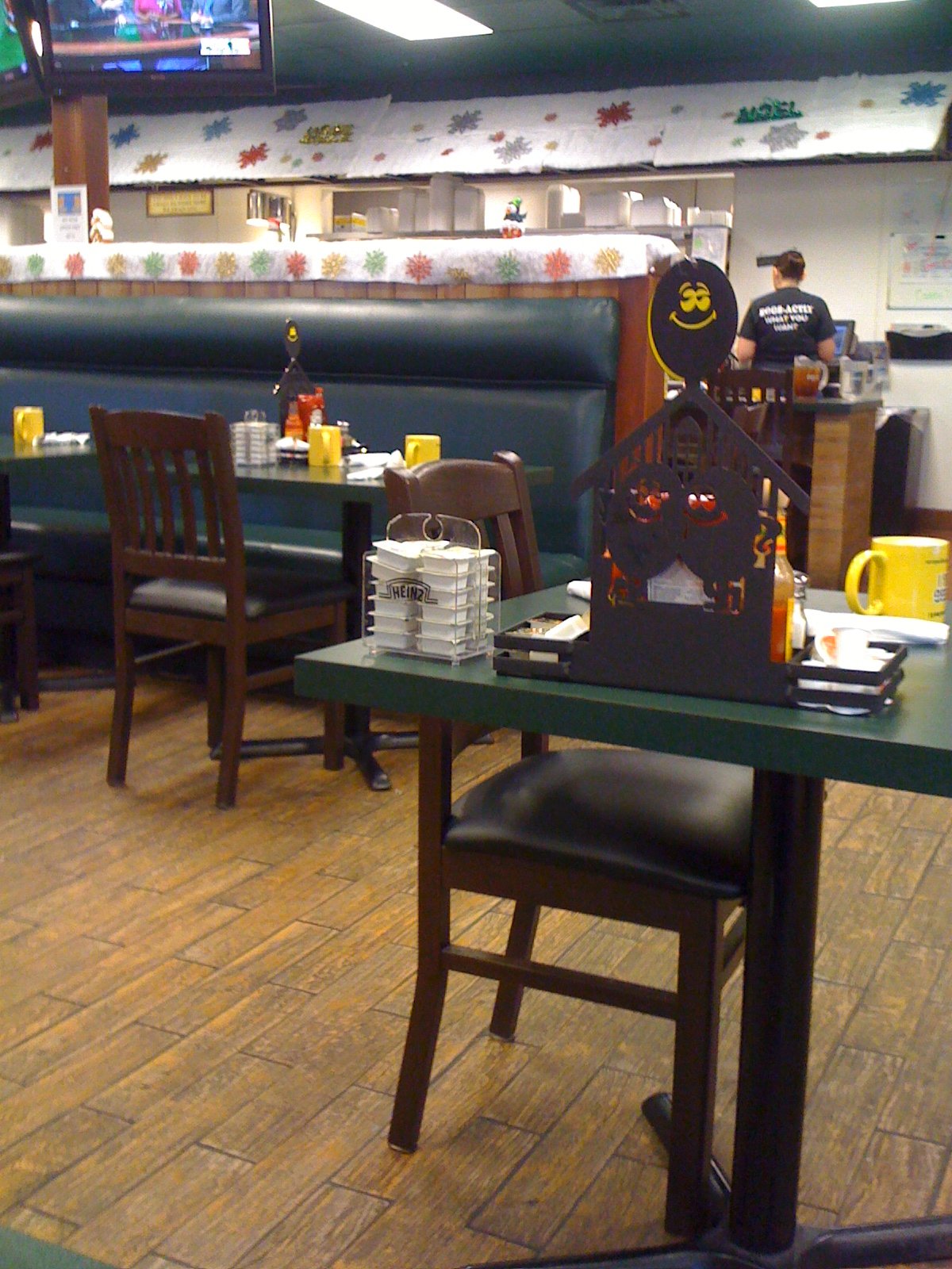 Seven television sets, free wifi, a coffee cup at every place setting. Breakfast and lunches. Owned by people who own The Egg and I (a restaurant I used to go to when growing up in Detroit-the first restaurant that sent us Birthday Club Cards, the first place my parents remember getting a thermal pot of coffee left at the table… a Midwestern chain which makes and serves Cincy Chili) That black egg face flips to become yellow and is a signal for any passing waitress that you would like their attention.