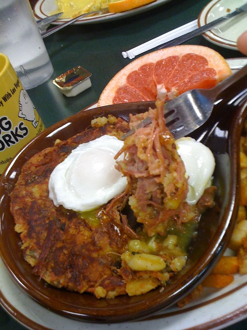I ordered the Home Made Corned Beef Skillet ($9.95). Really meaty corned beef hash, made with green peppers and onions and potatoes, topped with two poached eggs. Excellent. If you are in Las Vegas, this is the place to have a very good sit down breakfast. There are three locations.