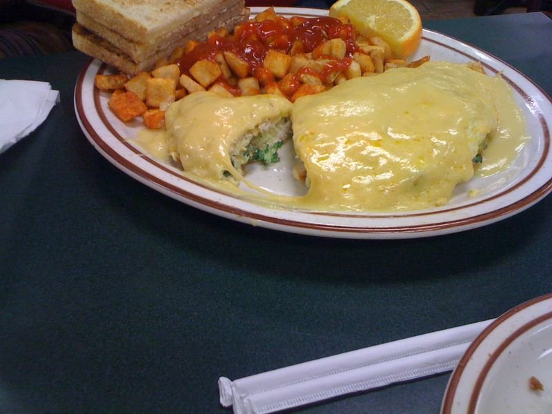 Ms. T ordered the chalkboard special Northern California Omelette ($9.25) Four eggs, chicken, broccoli and mushrooms, topped with a cheese-Hollandaise-like sauce. Fresh and filling and good. It came with a side of Works potatoes and the toast.
