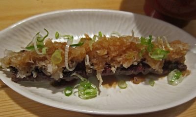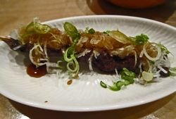 Basically pork rolled around shiso. The times I've had this, I really enjoyed it. I could make out the mint-anise hints of the shiso, a problem with versions of this I've had elsewhere. The pork itself, betrayed its' "other white meat" heritage, and was fairly moist, and the smokey flavors of binchotan really does well with pork.