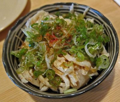 This version has a nice sprinkling of togarashi to add a mild hint of spice. The amount of ponzu is good, and the chicken skin is sliced into nice uniform thin strips. I enjoy this version.