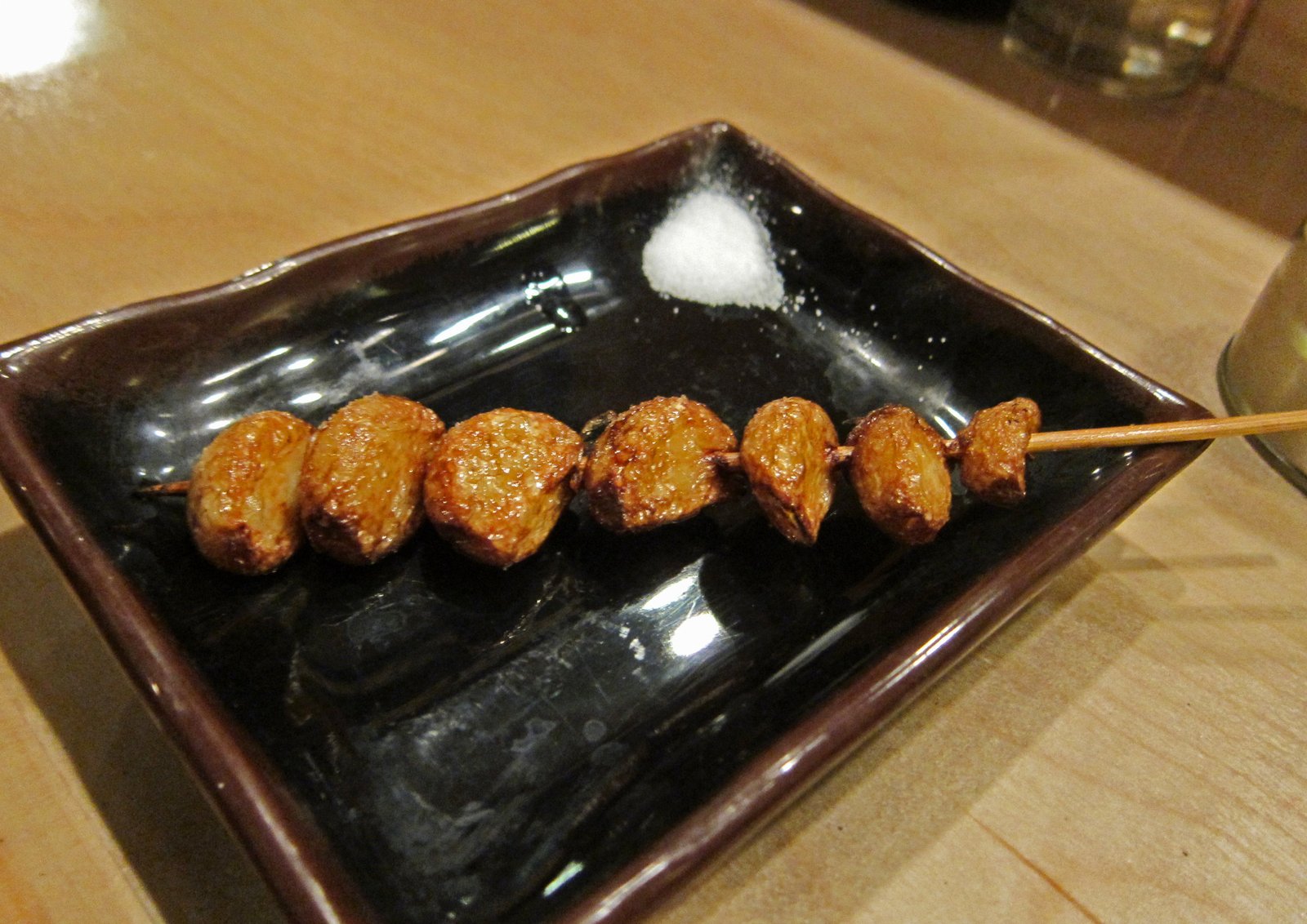 Instead of the usual course ground chicken meatball…… in this case the chicken has been worked into almost a mousse. The exterior, touched by the charcoal adds a crisp counter-point. Here you can really make out Yakyudori's Tare. At times, it does seem a bit too rich and filling for me, but is hard to resist.
