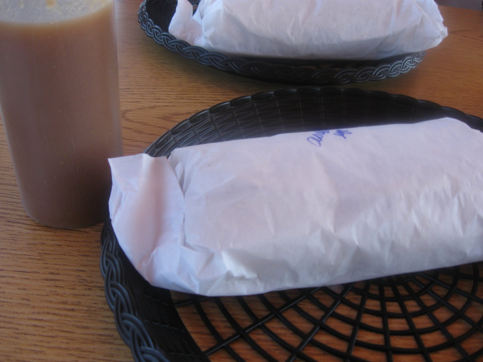Whether you get them to go or to eat at one of the eight or nine small tables on the premises, your burrito will come tightly wrapped with a napkin in paper:
