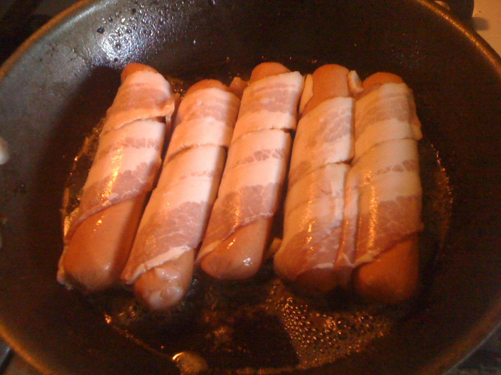 Five of those hot dogs were a pound. Most of the 'better' hot dogs are packaged seven to a pound. We needed large bread to hold these dogs. Costco. Less than $2.50 for 12 gourmet buns. (We used the extra ones for sandwiches and turned some into garlic bread). I just cooked the hot dogs in a large teflon coated pan on the stove top, turning until the bacon was crisp.