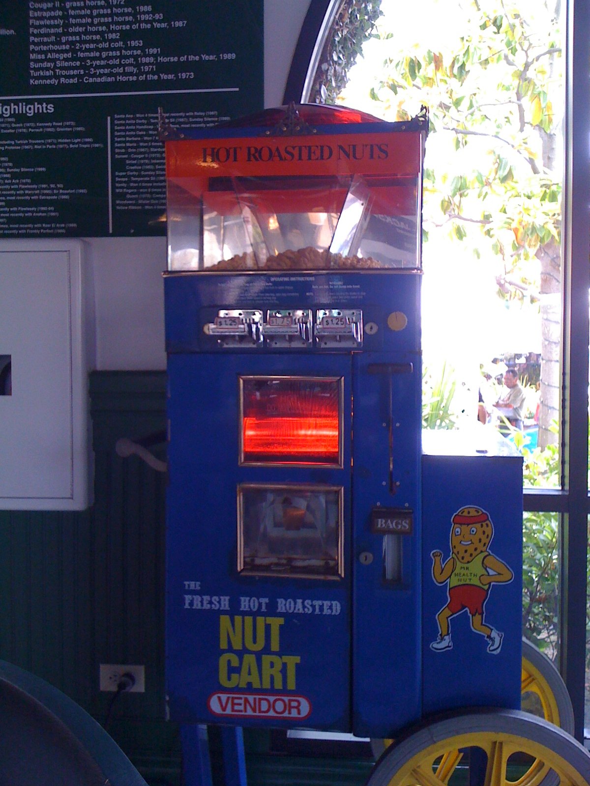 This machine disperses heated almonds and peanuts. It was located in the Paddock Bar at the Del Mar Race Track. I saw it when we were taking a lunch break at the Del Mar Fair. Really brings out the flavor. Now I heat up nuts in the fry pan before we eat them at home.