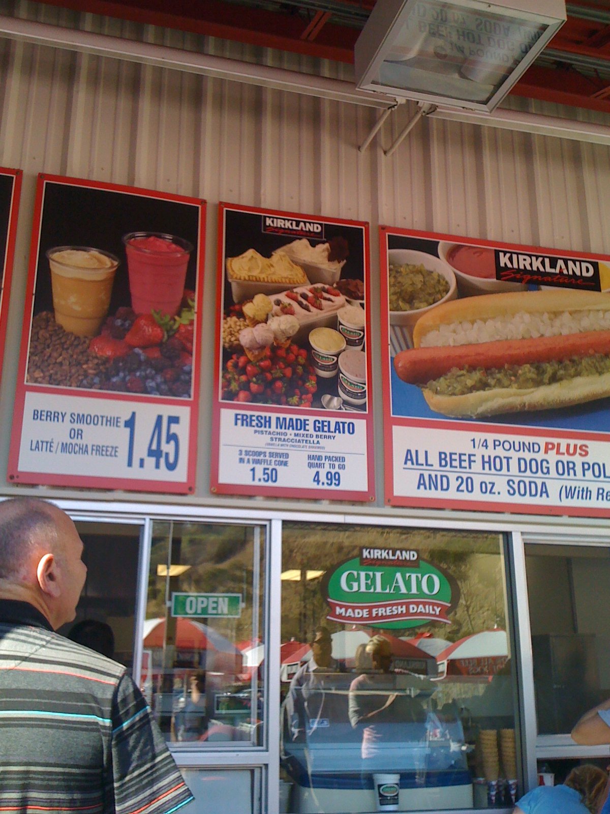 Made daily. $1.50 for three scoops- mixed berry, pistachio and stracciatella (torn apart/ less chunky chocolate chips in plain (not vanilla flavored) ice cream). Gelato is more dense than ice cream, is lower in sugar and lower in butterfat. It is made at this Costco location daily and a quart for $5 is a wonderful deal. I like the pistachio the best…fresh crispy nuts.