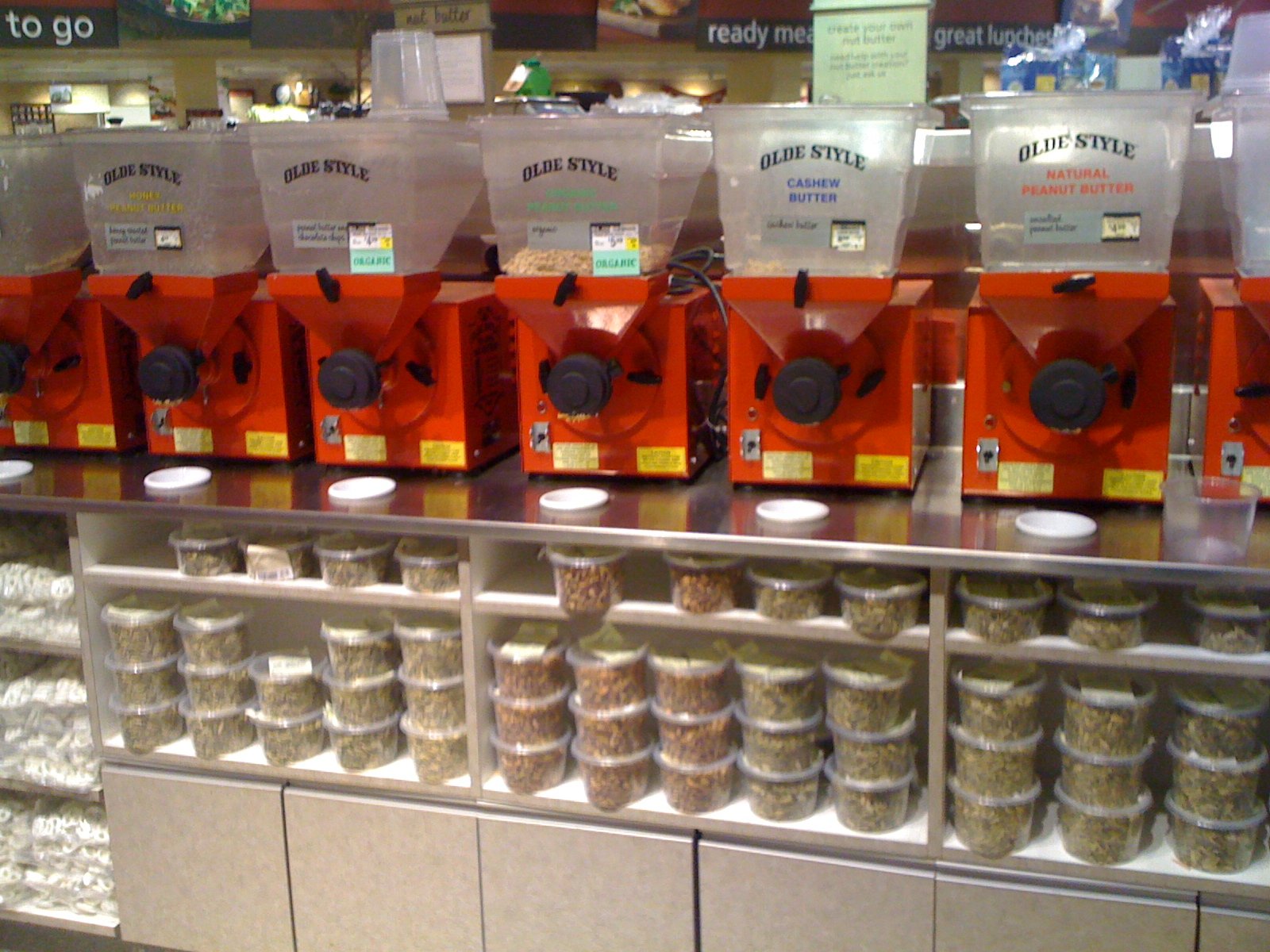 The Vons at Liberty Station (not the standard footprint Vons)(when you walk in the center/cart area, go to the building on your left) has a 'make your own nut butter' bar. Between $5 and $7 a pound, these bins were just about to be refilled with fresh nuts. You turn the crank and fill the containers provided. Right next to it were fill your own honey containers, two types of honey.