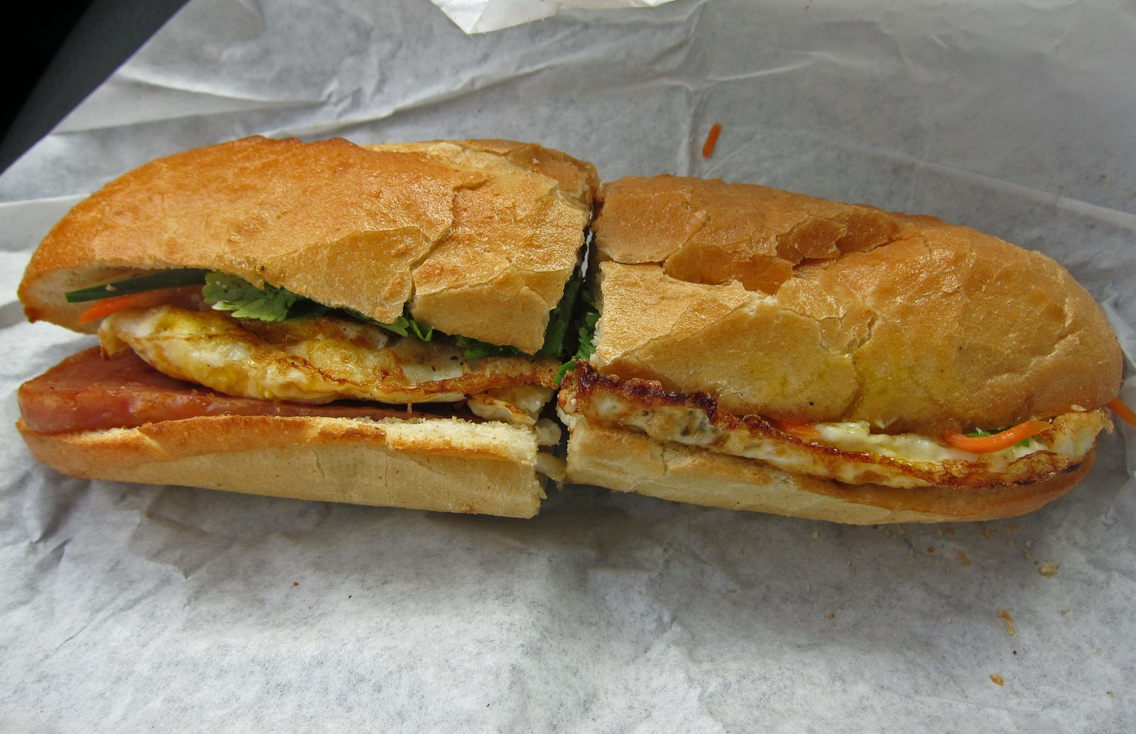 And if I wanted to get nit-picky, the eggs were cooked a bit more than I'd prefer, the pickled vegetables were still terrible, and all Banh Mi Trung (egg Banh Mi) should always have a sprinkling of Maggi. Still, this was a decent sandwich. But don't think it was a huge sandwich……