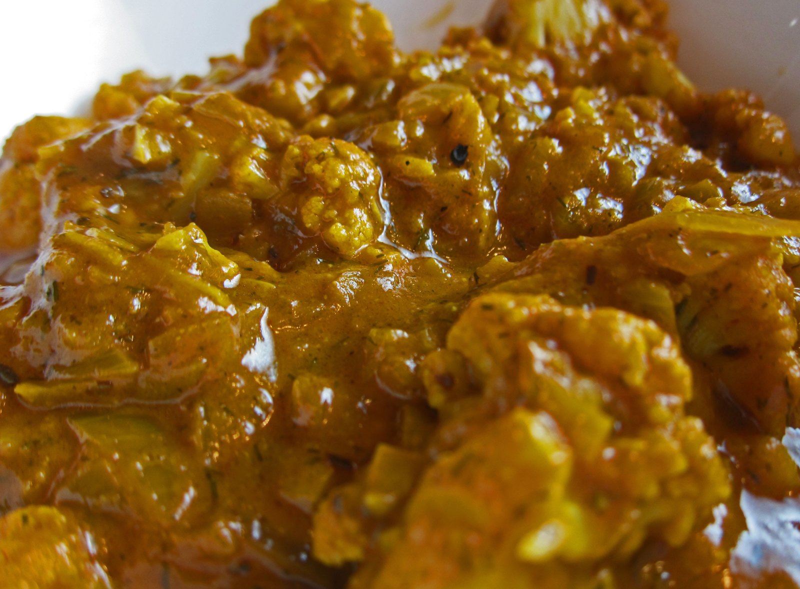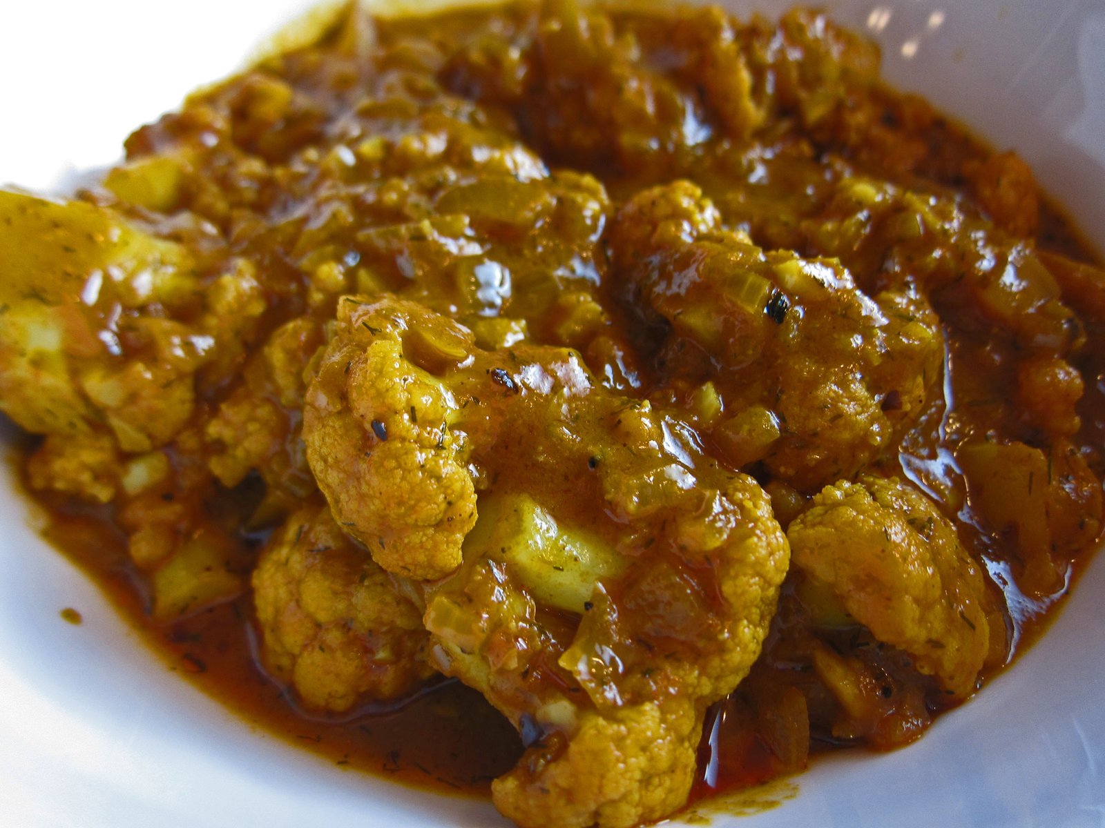 To this I added one large onion chopped, and seven cloves of garlic finely minced. Once the onions had started softening, I added 1 8 ounce can of tomato sauce and the dill. Once this mixture started bubbling I added my cauliflower, the equivalent of one medium head of florets, mixing to coat the cauliflower. Once the florets were coated I added 1/2 cup of water, mixed well, tasted the sauce and added salt and pepper to taste, and adjusted the flavor a bit further with more (quite a bit) curry powder. I then lowered the temperature, gave cauliflower a good mix, and covered the dish. I'd open and stir every five minutes or so, and added water, in quarter cup portions twice to keep the sauce from getting too dry. After about twenty minutes or so, the cauliflower had reached the desired texture……soft and almost buttery.