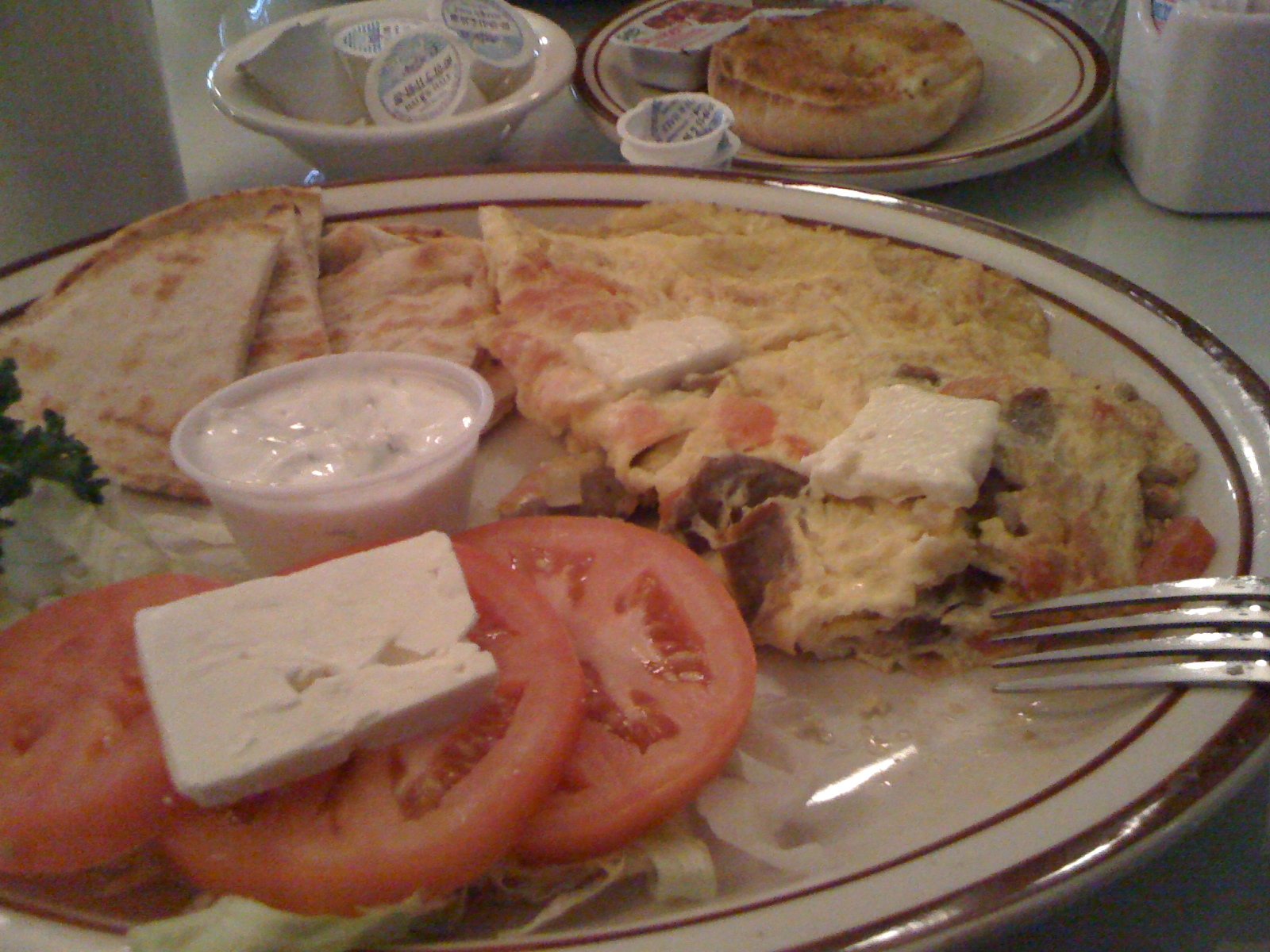 I wanted something more "Greek" and since it was still breakfast time, I ordered the gyros omelette (7.95). Gyros meat and tomatoes mixed with the egg and topped with Feta cheese and served with the tomatoes, lettuce, more Feta, tzatziki sauce and pita bread. Excellent flavors, satisfying my cravings.