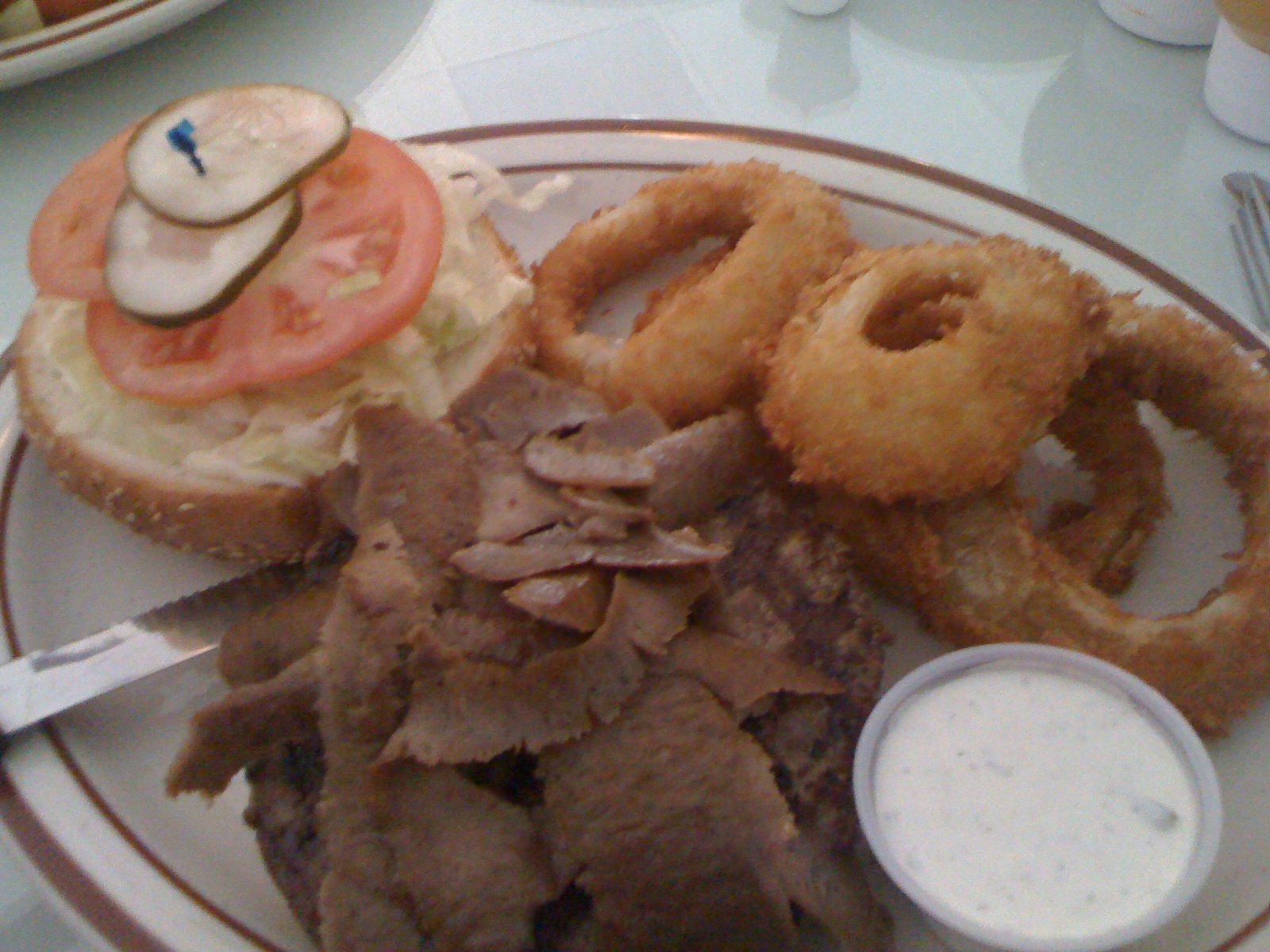 I decided to try the 1/2 pound gyro burger ($6.95) and pulled out the gyros meat for this photo. The addition of hand breaded onion rings was $2.95 and worth it. Excellent frying technique.