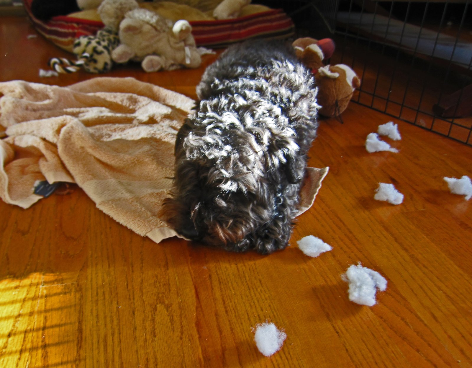 So I came home today to find our living room a mess…… towels strewn about, stuffing from disembowled doggy toys everywhere……. and in the midst of it all was Sammy…. giving me his best pathetic "you know I'm innocent until proven guilty" look. (Do you notice that piece of stuffing material on his nose? Hmmm……)