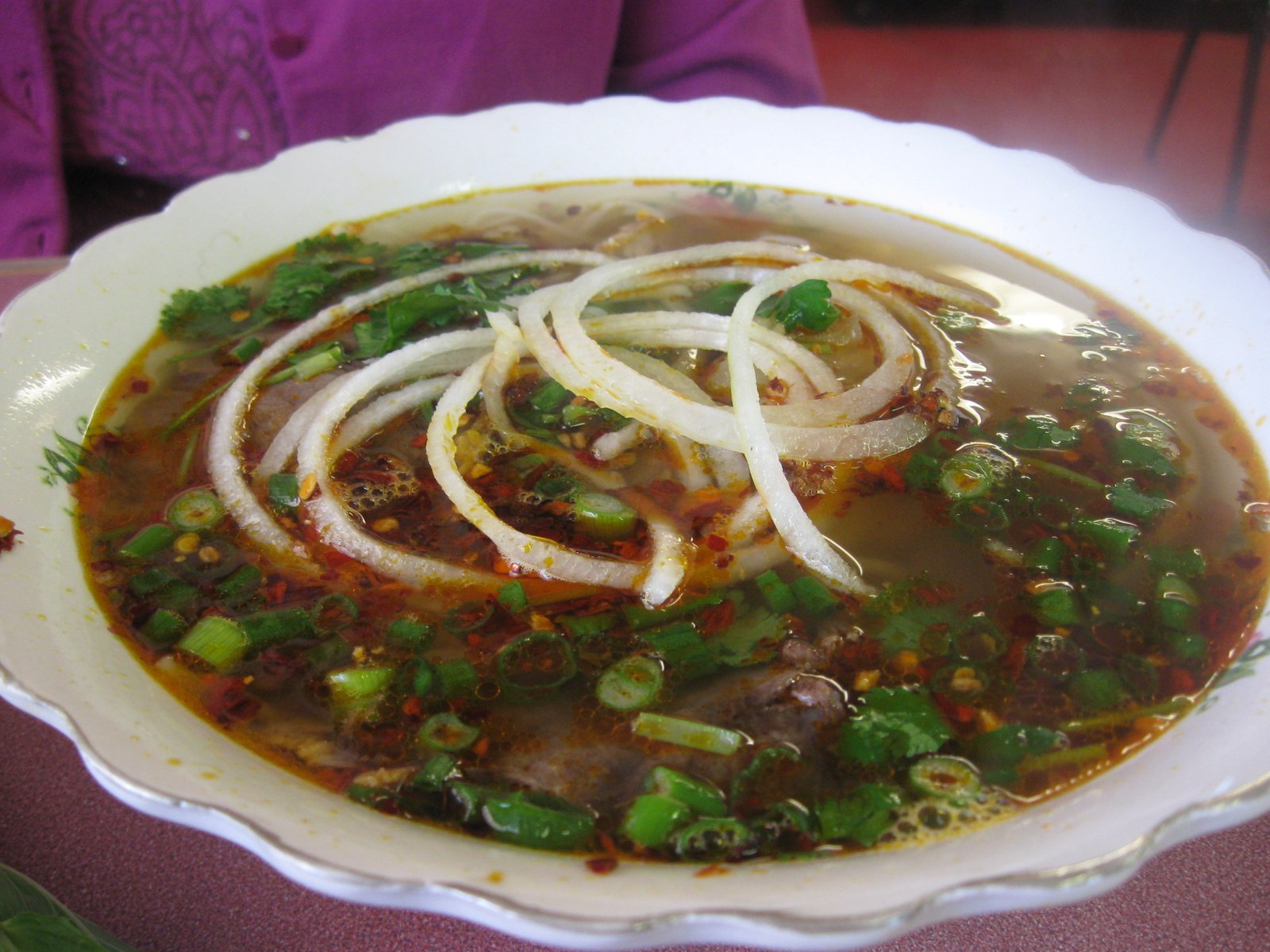 Looking over the menu, we realized that this was primarily a noodle House, with bun, pho, hu, and mi dishes predominating. That made ordering easy. A large combination pho and bun bo hue.