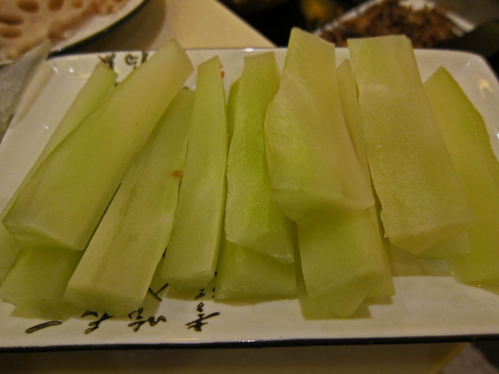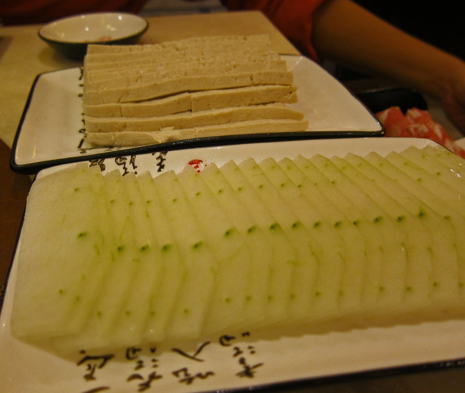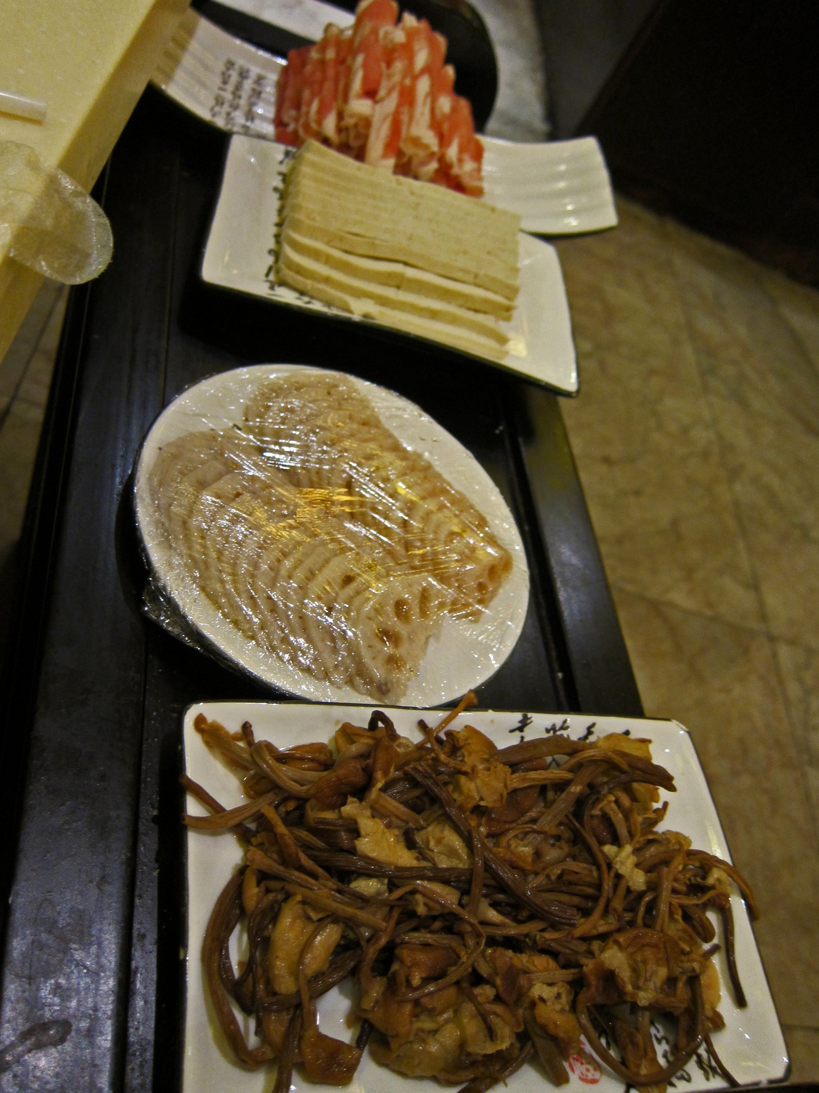 There actually was a pretty good sized leg bone, with a decent amount of meat attached to it in the broth, along with cucumber, carrots, napa cabbage, and bean curd strips. The hot pot had a nice lamb flavor, making frozen bean curd a perfect ingredient. The only meat we had was fatty sliced lamb.