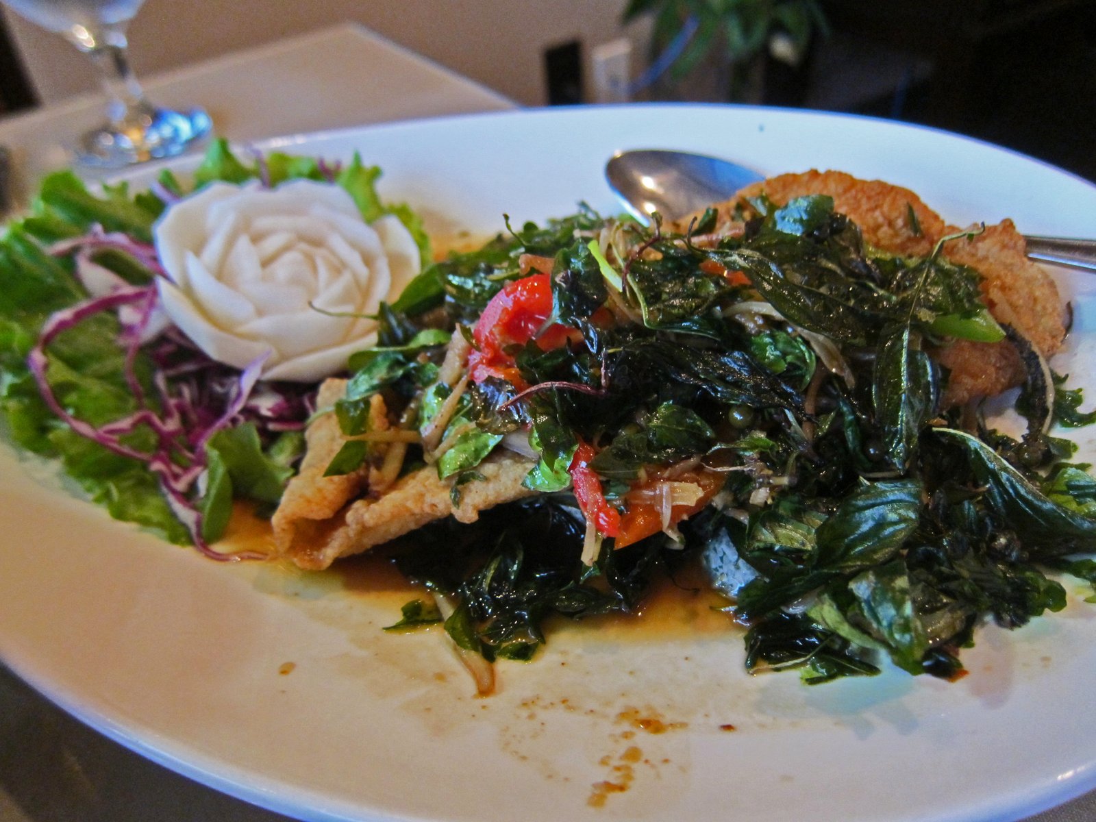 The overall flavor was surprisingly mild….. I was expecting something worthy of Yai Restaurant. The tilapia in this case tasted a bit on the muddy side.