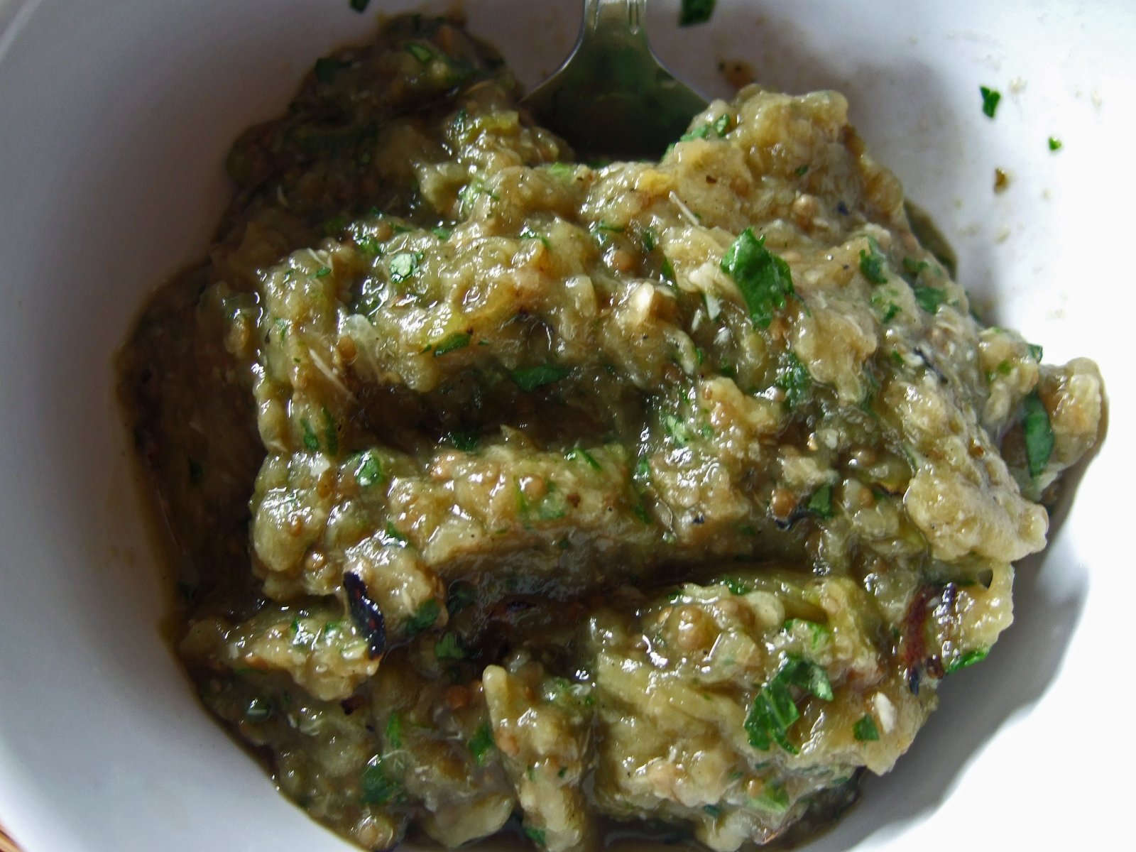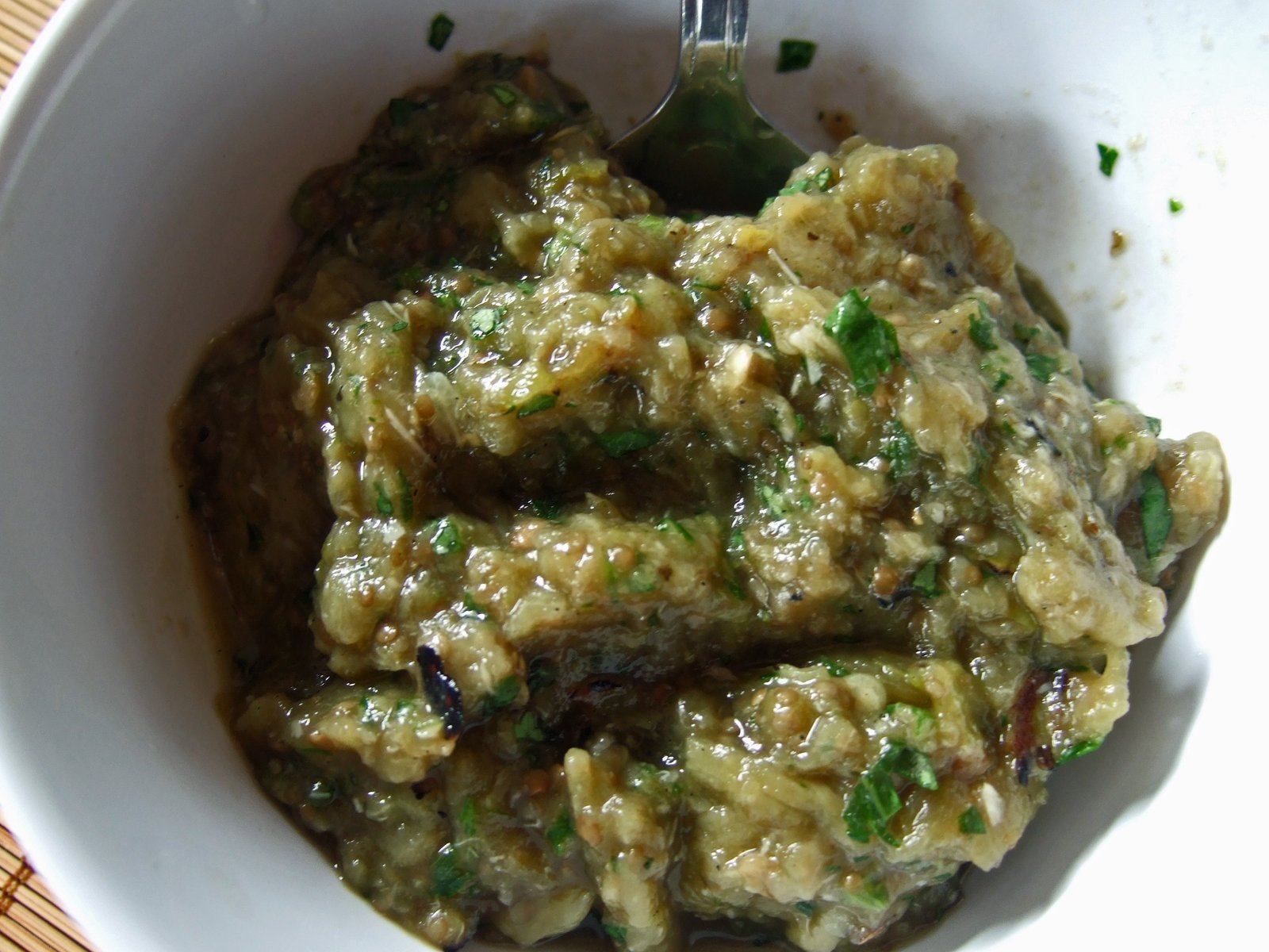 – Grill eggplant, chili, and garlic, until the skin is blackened. I usually grill right over hot charcoal which adds a layer of smokiness to the dish, but you can do the same over a gas flame or under the broiler.