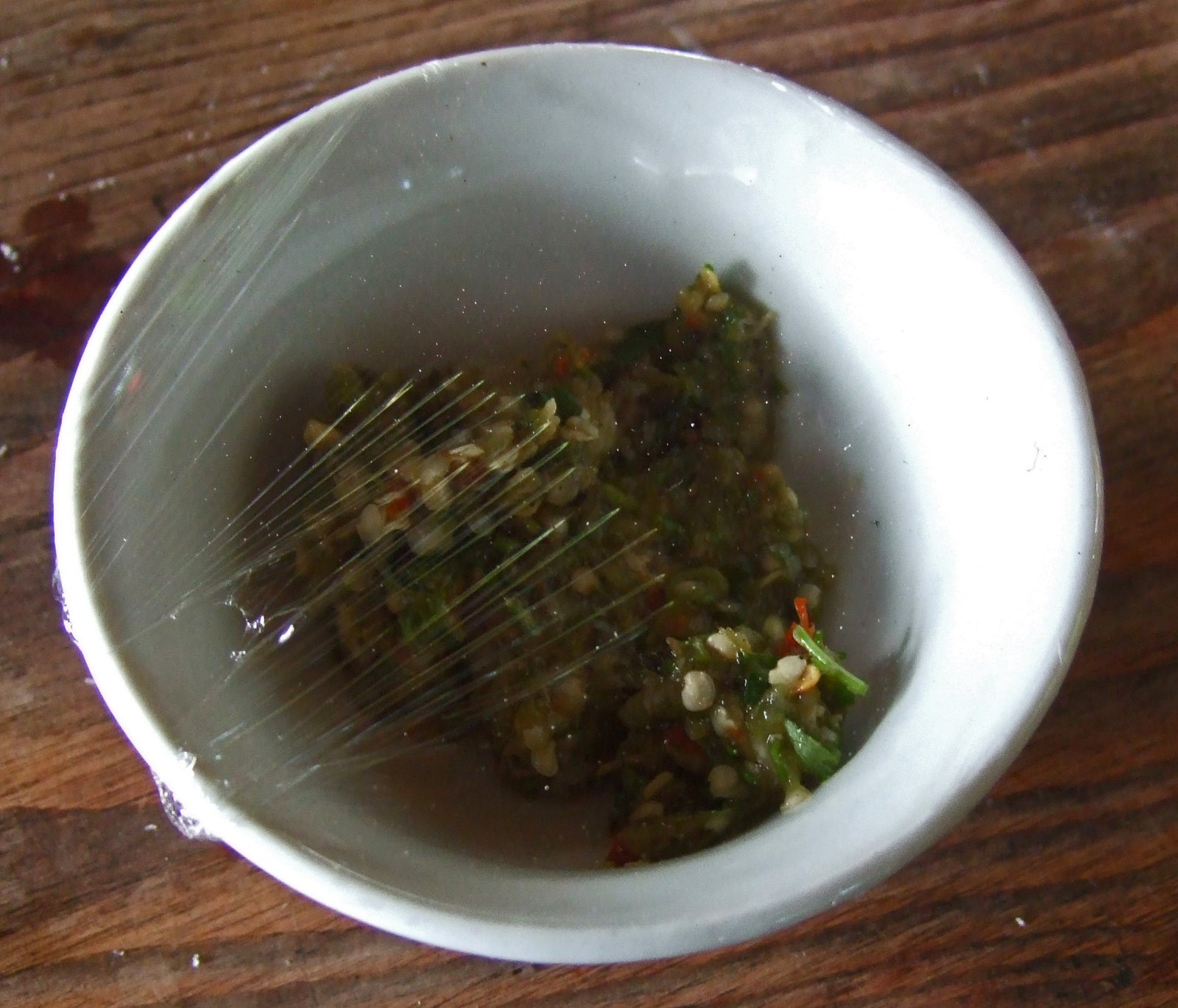 – Pound the garlic, chili, and salt together in a mortar to make a paste.