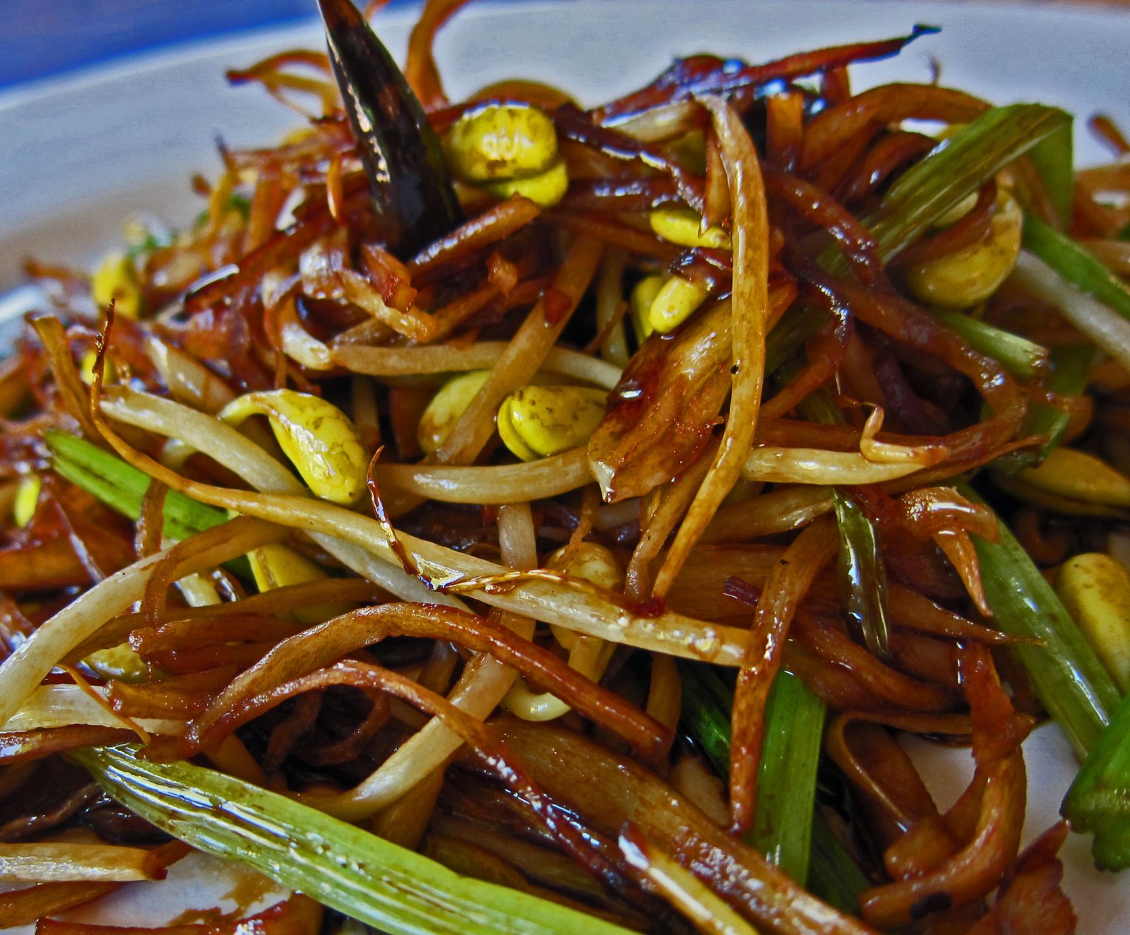 I julienned the mushrooms lengthwise into matchsticks. I also replaced the lily buds with mung bean sprouts which would bring more crunch and a nice flavor to the dish.