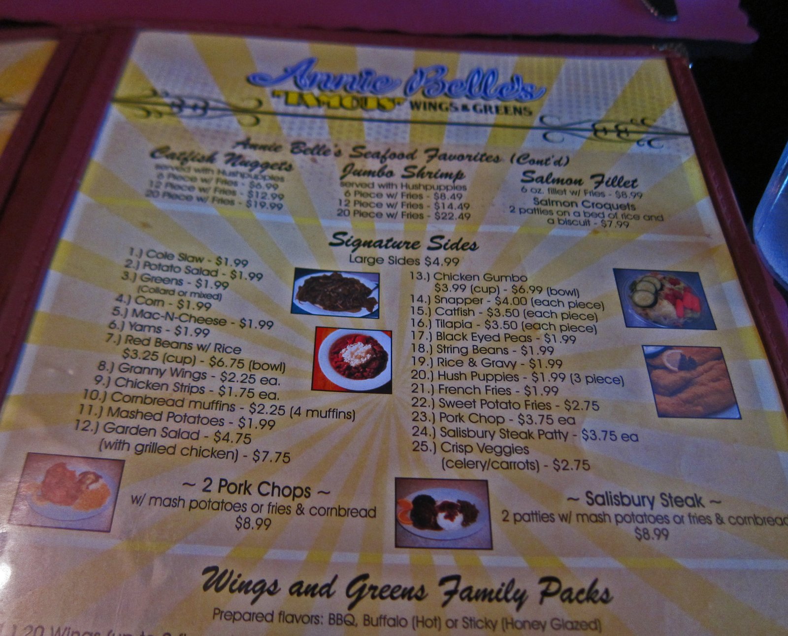 The menu was pretty large…. with almost every single "side" known to mankind…. wow, so many choices. I was looking for fried chicken. And while you can buy it by the piece, the name of the place is "Annie Belle's Famous Wings and Greens", so I went with the Wings and Greens House Special ($8.49), They call the wings they serve here "Granny Wings" and there are two served with this special. Two wings? That seemed a bit pricey, I hope they weren't what came off a "Granny Hen"….. and they weren't.