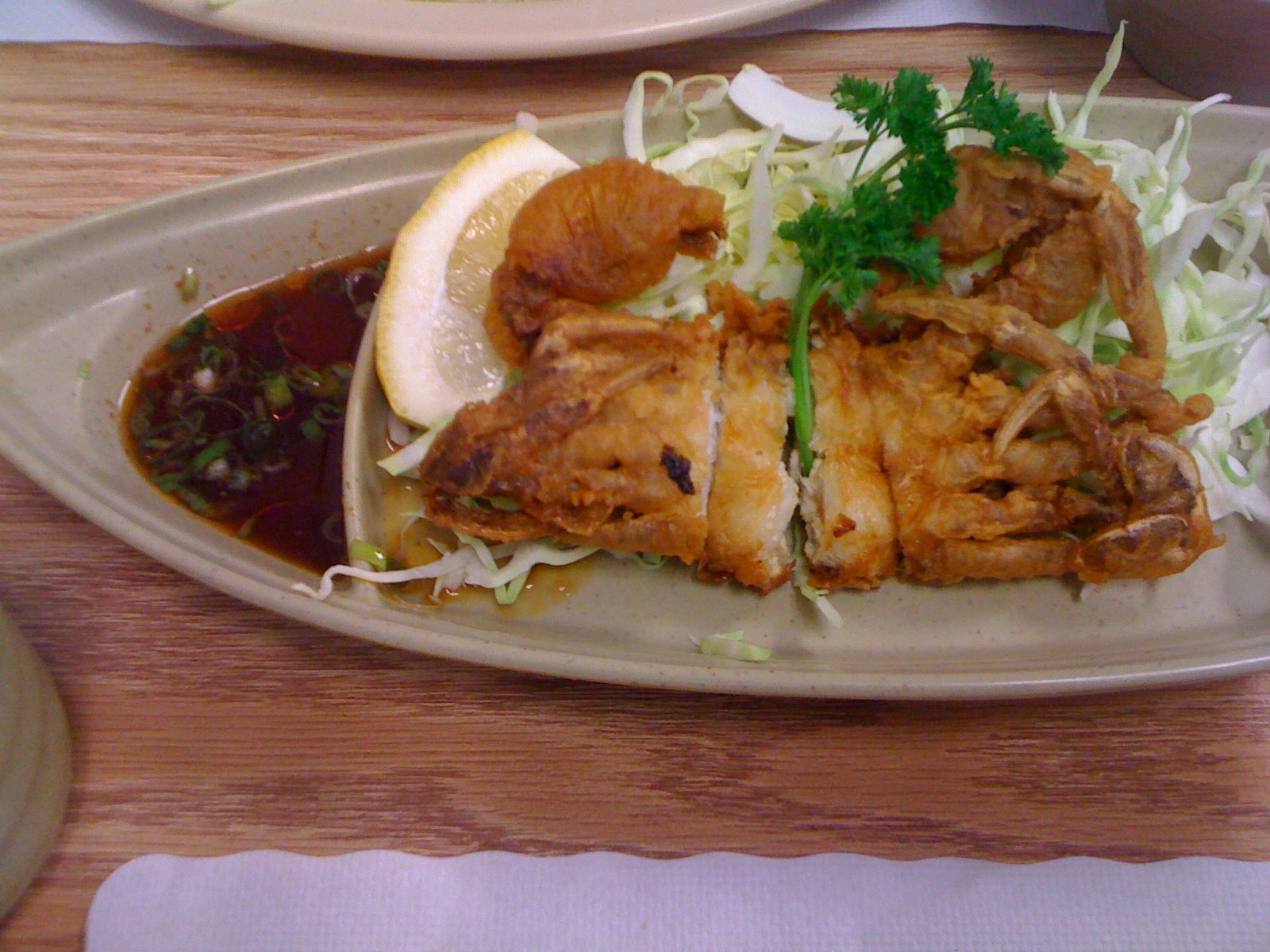 The soft shell crab appetizer ($5.95). Perfectly fried, not at all greasy. Light batter. Served in this boat shaped platter with a light sauce which was not needed if you had already squeezed the lemon onto the crab. I did, however, dip some of the cabbage, which was a cushion under the crab, into the sauce and the flavor of the sauce went with the cabbage. This was a very good size crab and appetizer.