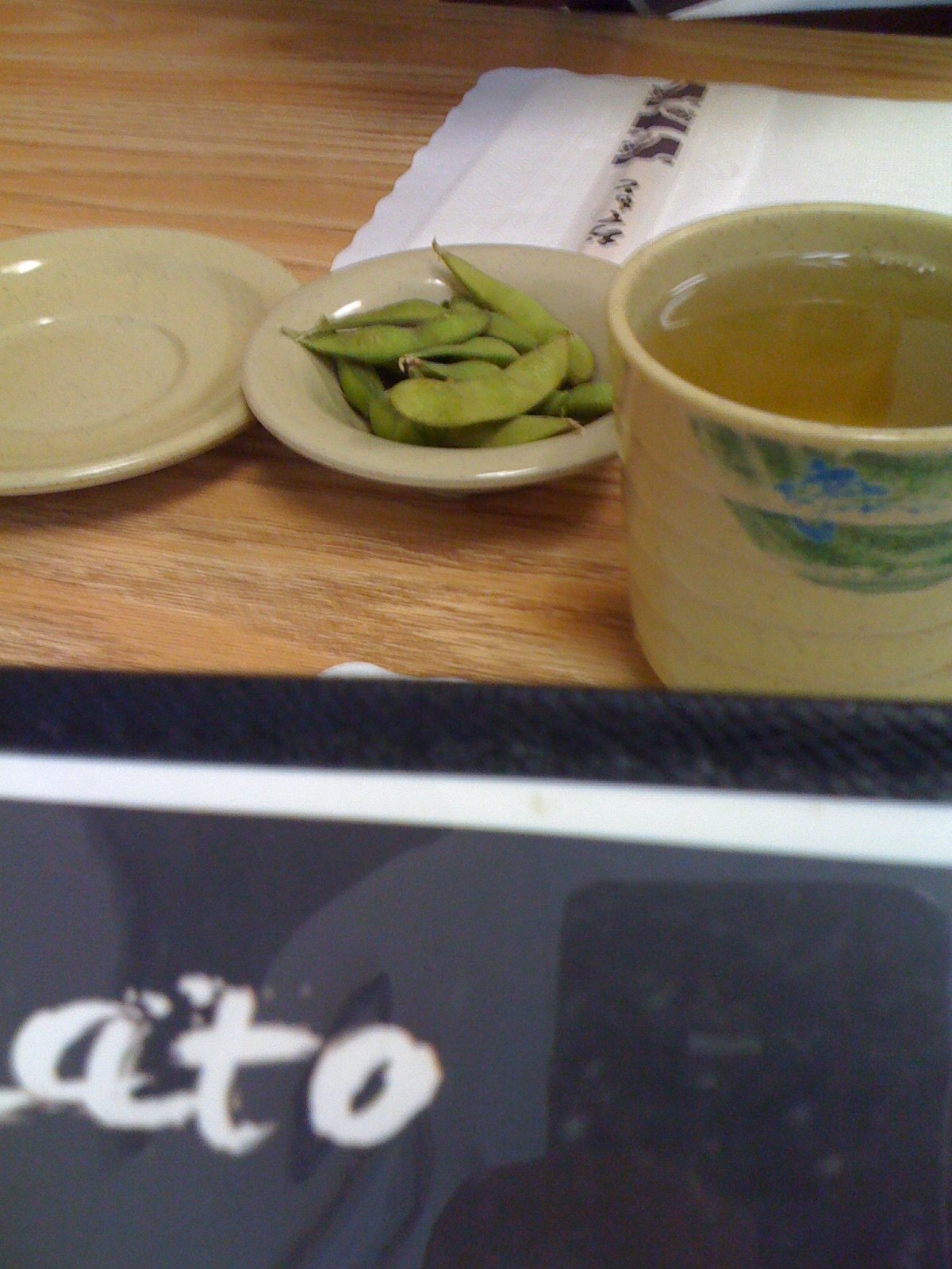When you are seated and start to look at your menu, your beverages and a small bowl of edamame are brought out. I've noticed different preparations and presentation of edamame lately and will try to document in the future. These were simply steamed and cooled fresh soybeans…no salt added, crisp and fresh in flavor. The green tea is complimentary also.