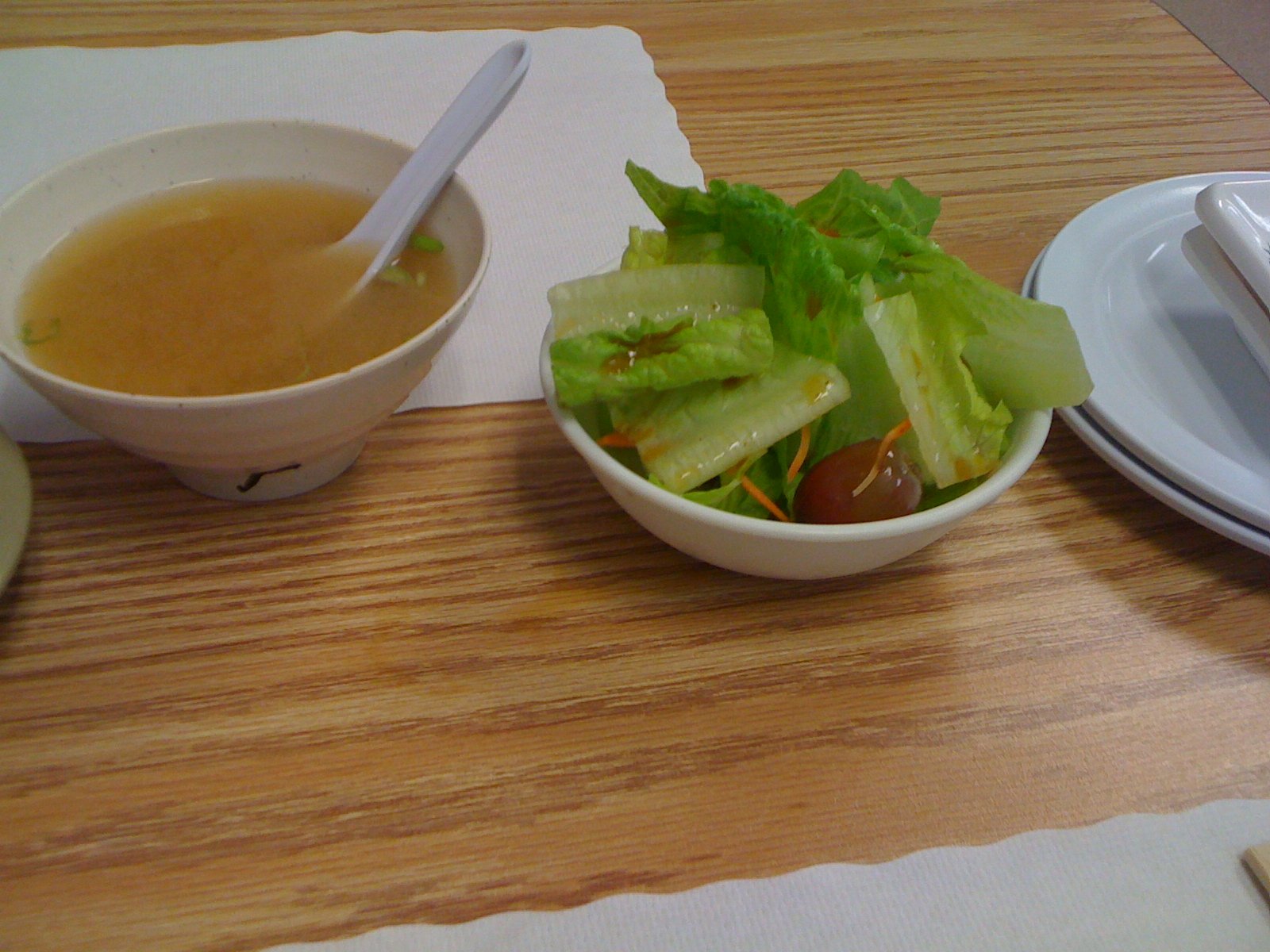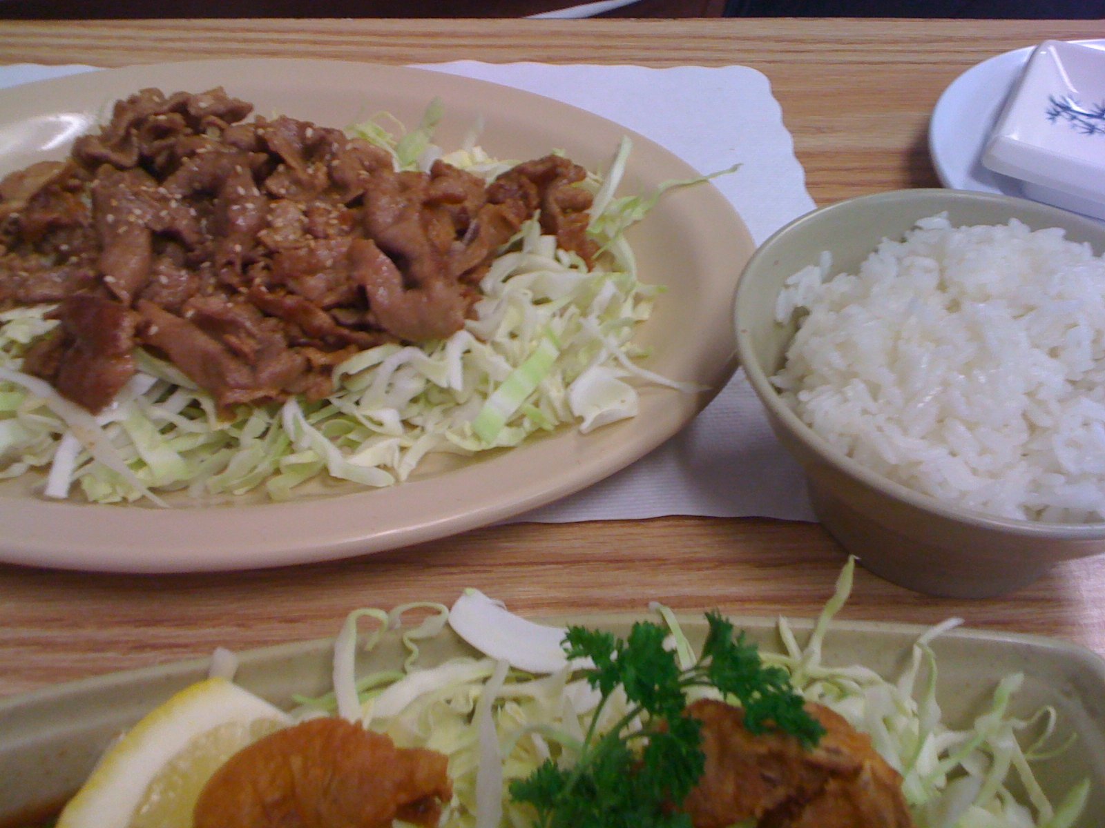 The Mister's plate included the rice and a miso soup (good, with lots of tofu) and this extremely crisp salad. (Both were brought out before the three dishes from the kitchen, if you were reading along and not just looking at photos.) Unusually, remarkably fresh crispy tasty romaine lettuce topped with a gentle sesame-ginger dressing. I can't emphasize the freshness of this lettuce. The small grape, instead of a tomato was a colorful touch…