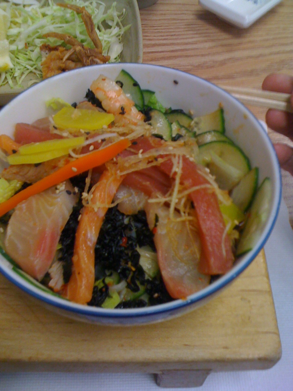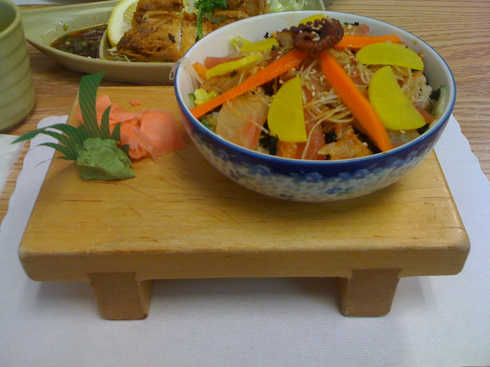 I wanted to try the Sunomono, described as "Variety of rawfish with cucumber, seaweed topped with special vinegar sauce" ($9.95). There was a small amount of lettuce, a lot of thinly sliced cucumber, an interesting, curly black seaweed, the radishes and burdock, as you see…that bit of octopus tentacle and a shrimp, some crab, hamachi, albacore, salmon and some bits of a cooked fish.