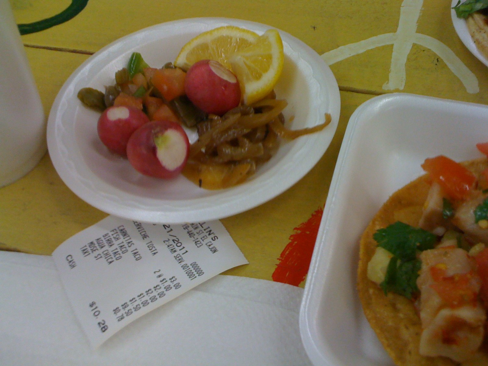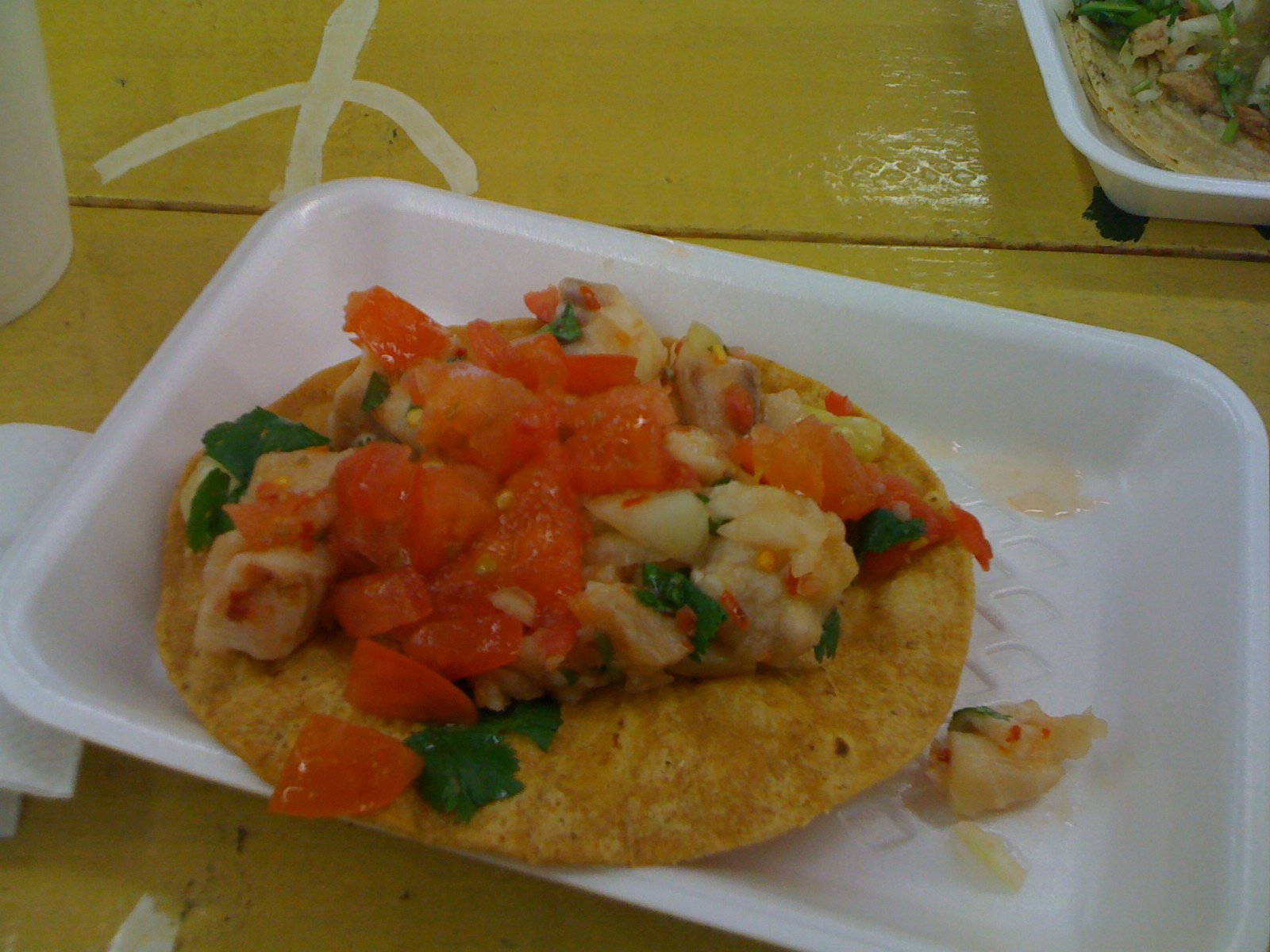 The carnitas tacos have been simmering and are rich flavored. Those are my favorite. The fish ceviche tostada ($3) is fresh and brightly flavored. Both carnitas and ceviche are sold by the pound at the Deli counter in the store, as are guacamole, salsa, refried beans, chicharrones…
