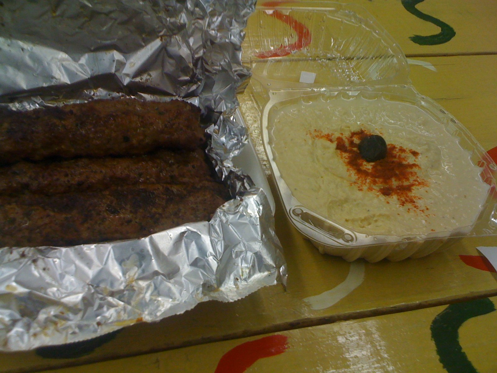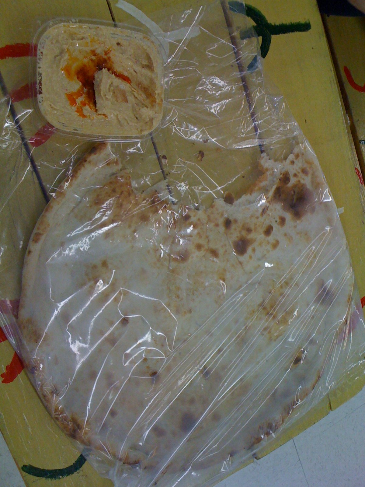 Gigantic super sized flat bread, as large as the top of the indoor picnic table where we eat. Hot from the oven…the freshest you can get. Fresh hummus ($2.99) sold in the refrigerator next to the cash register, is the accompaniment.