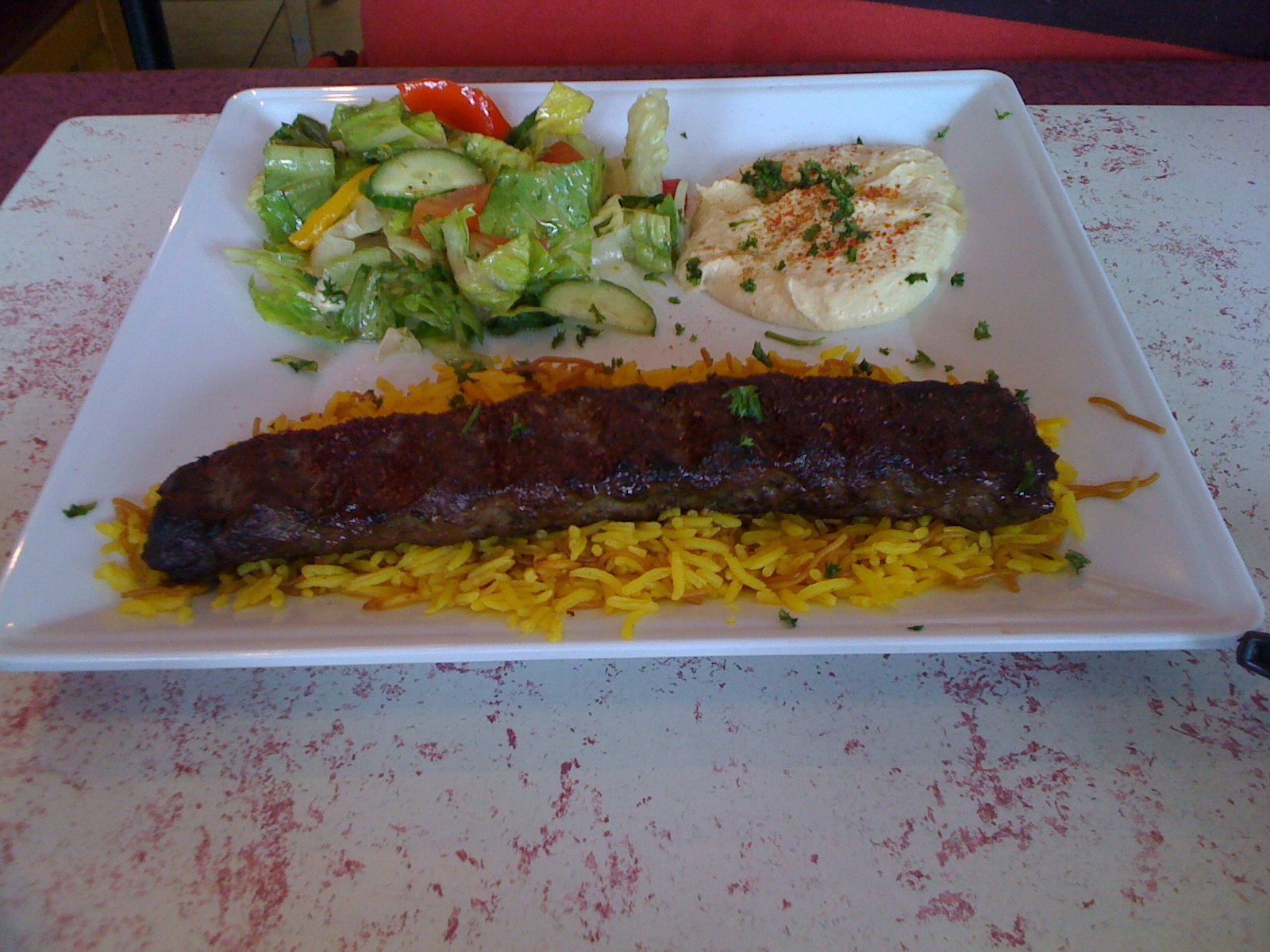 A combo plate with a beef Kufta kabob (~$9) and salad. The salad was fresh with cucumber, radish slices and red and yellow bell peppers and a good oil/vinegar/herb dressing. The kabob had a great flavor of spices. I think it was zatar (tarragon, sumac and sesame) but also tasted some cumin and maybe ginger…anyway, it was good, juicy, moist but not greasy. Both of the plates were served with a plate of plain (not baked here) pita bread.