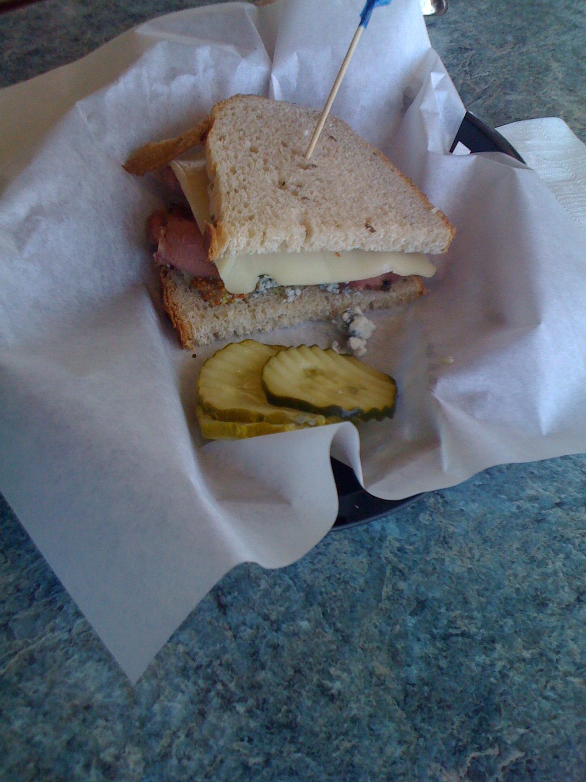 Not traditional. The organic rye was sliced thin and had a good sour flavor. The pastrami, a good amount, thick sliced and mildly smoke flavored is heated, the rest of the ingredients are cold and warmed only by the Pastrami.  As you can see- Swiss cheese.  As you can also see, whole grain Dijon mustard. There is also a light shmear of  horseradish.  Then there is the Gorgonzola.