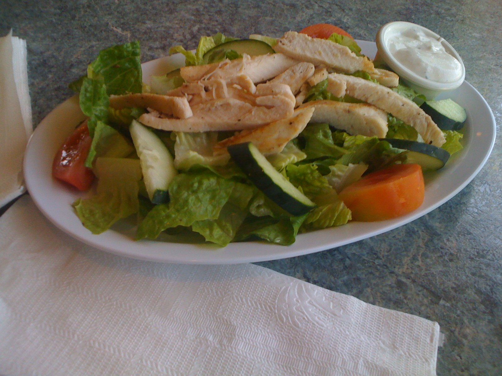 Since we hadn't planned on stopping anywhere for lunch, we ordered light.  The Mister chose the House salad, with grilled chicken breast ($4.95) Yes.  The House salad by itself is $3.95.  Since they have grills for the panini sandwiches, they can grill a chicken breast.  For one dollar.   The salad is all Romaine lettuce and tomato and cucumber and croutons (oops…those seem to be missing, my bad) and a very good size meal.