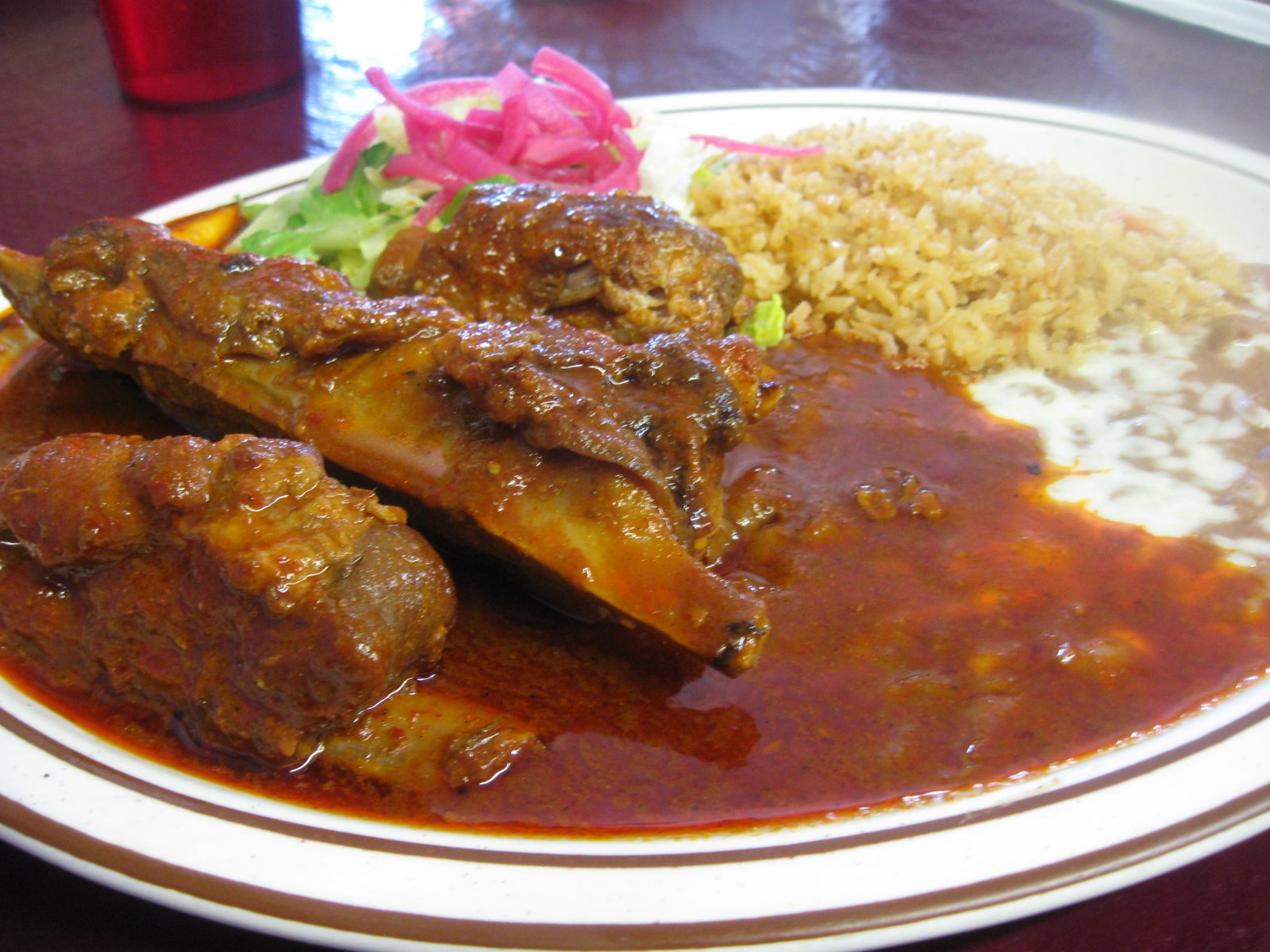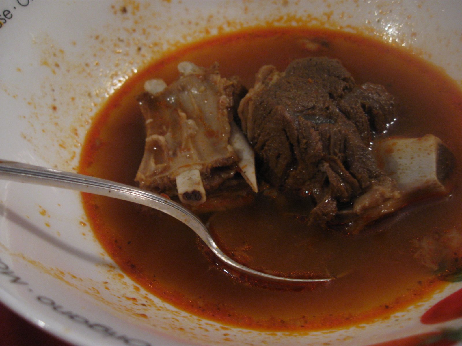 El Zarape is also one of the few places in town that regularly has birria de chivo ($9.50). None of my pictures of the dish is worth the electrons it would take to post here, so to give you an idea of the birria, here is what a couple of the chunks of goat meat looked like in a little of the broth: