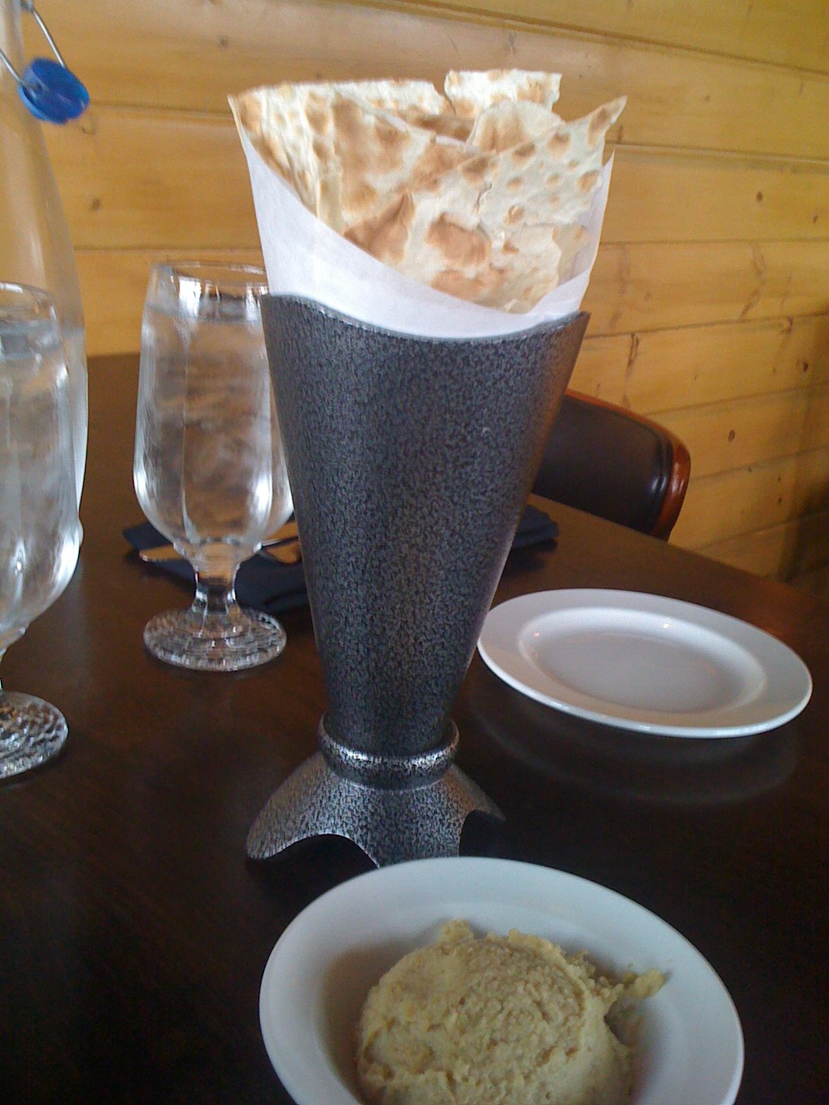 Also a cone shaped vessel, filled with a fresh made cracker-like flatbread and fresh made hummus is brought out to the table. The hummus is excellent.