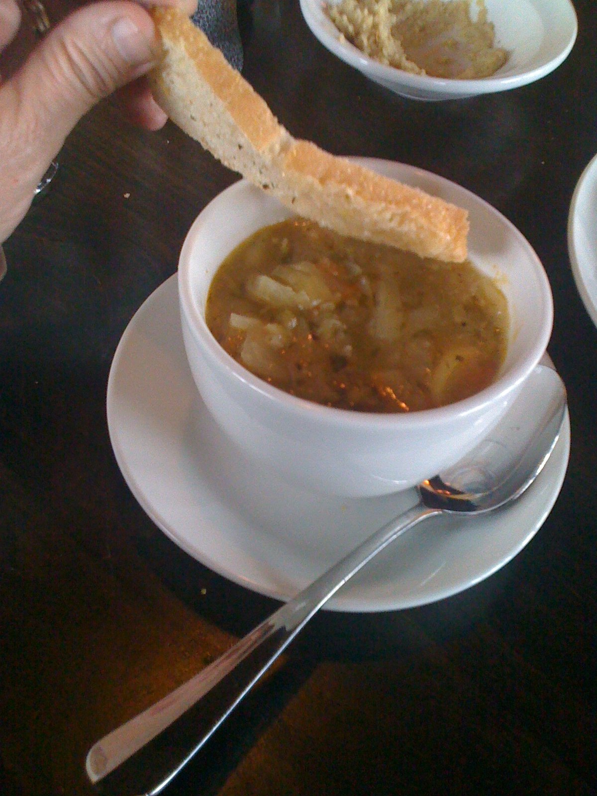 For my meal, I chose a cup of the soup of the day ($4). It was vegetable soup. Excellent vegetable soup. Barely any broth, but what I did taste was rich flavored (it was a chicken broth and not vegetable) filled with squash, cabbage, carrot, potato, onion. Very hearty and excellent.