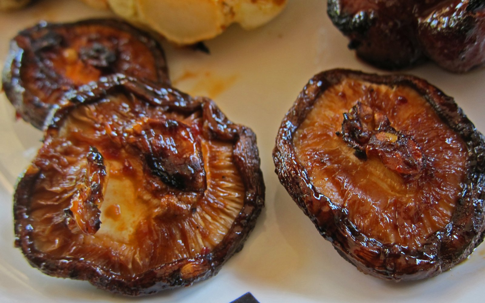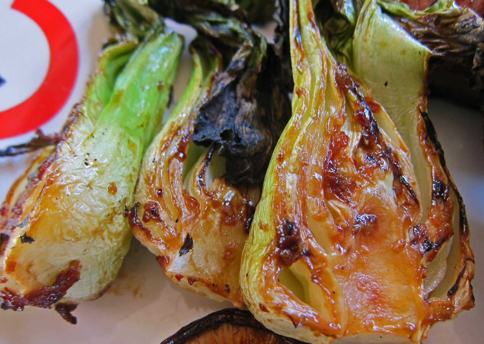 I served the chops with some grilled shiitake mushrooms and bok choy which I basted with a mixture of soy sauce, oyster sauce, sugar, sambal olek, chili oil(the stuff I make at home), and sesame oil. I gotta work on my bok choy grilling technique… the leaves tend to burn too quickly. And no, I'm not soaking them in water as they turn out mushy…..