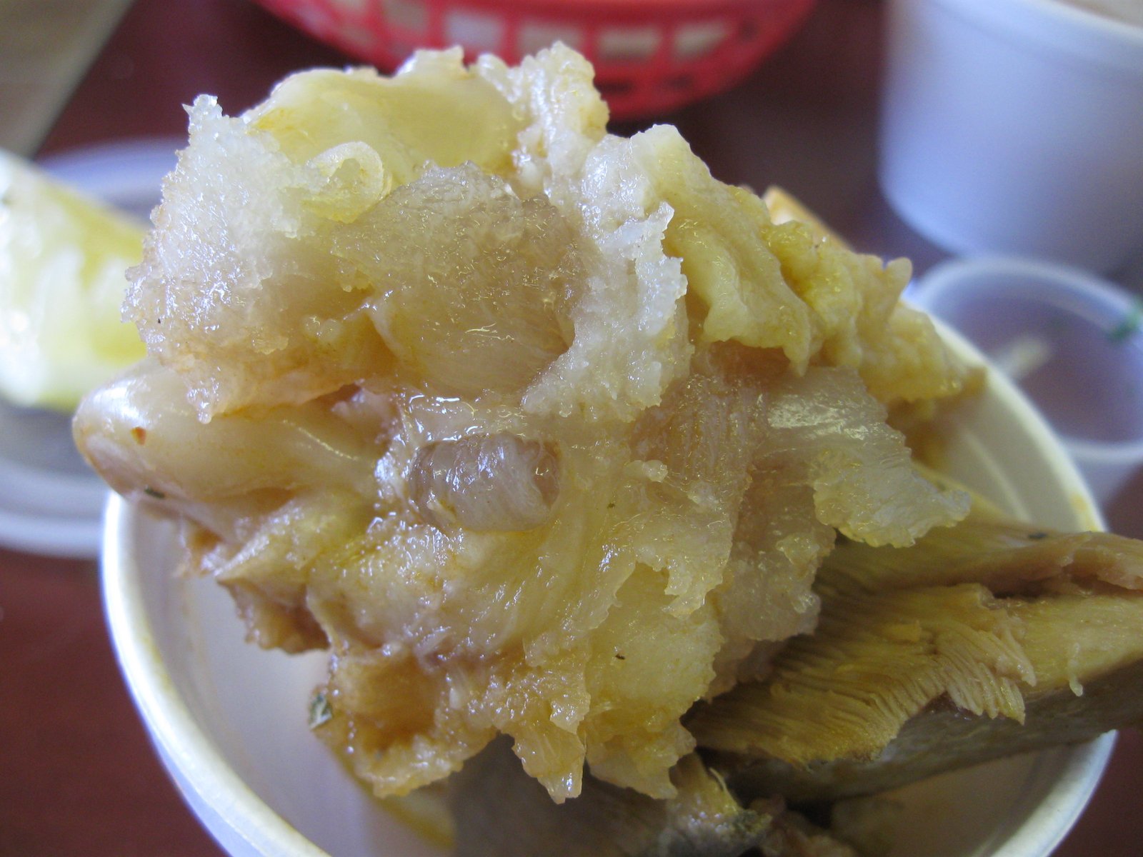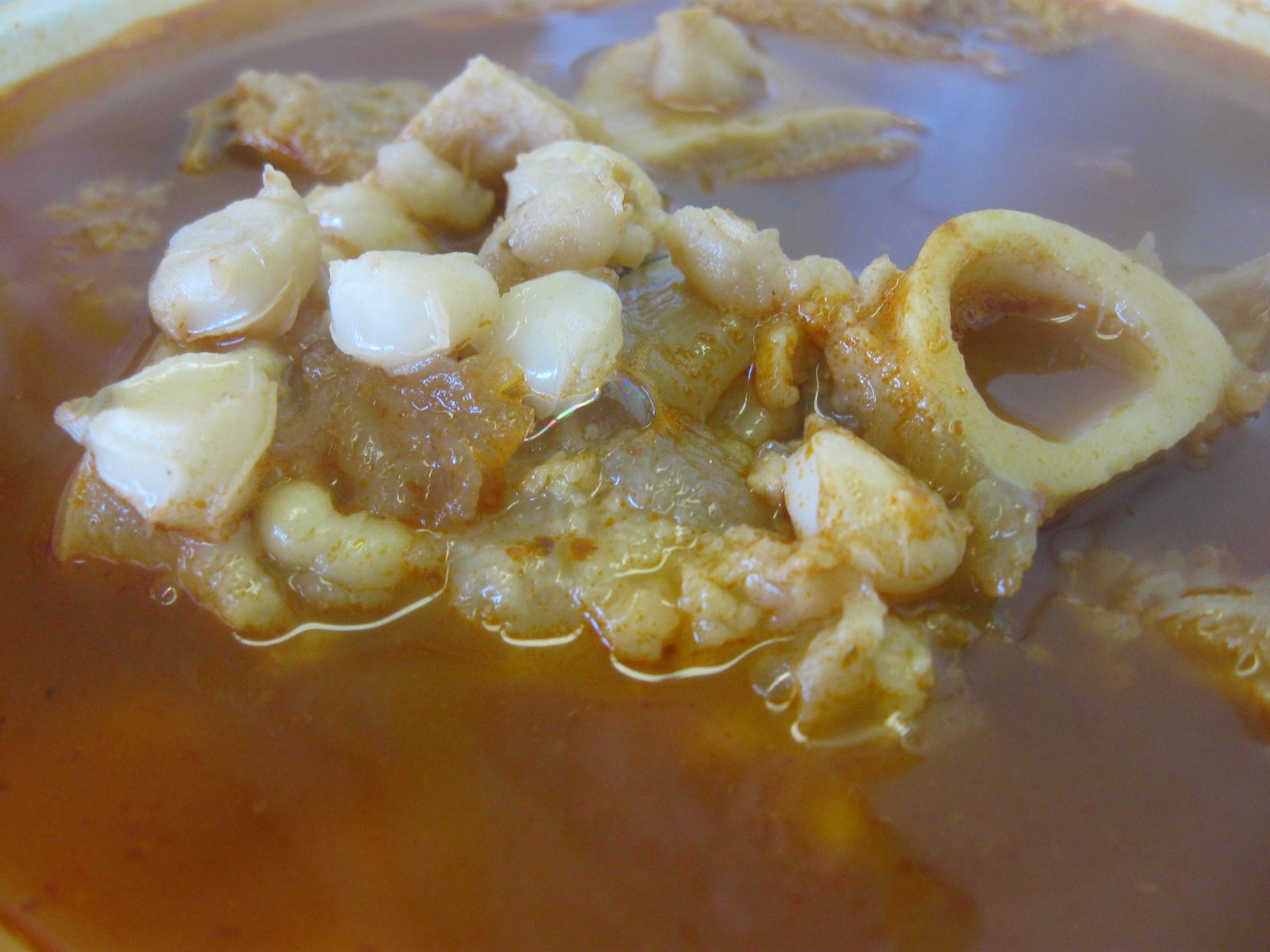 Look at all that tripe and hominy! But what I find most truly satisfying about the Menudo here is that pata, a big piece of cow hoof. And when I get lucky, the hoof is completely covered with wonderfully chewy tendon: