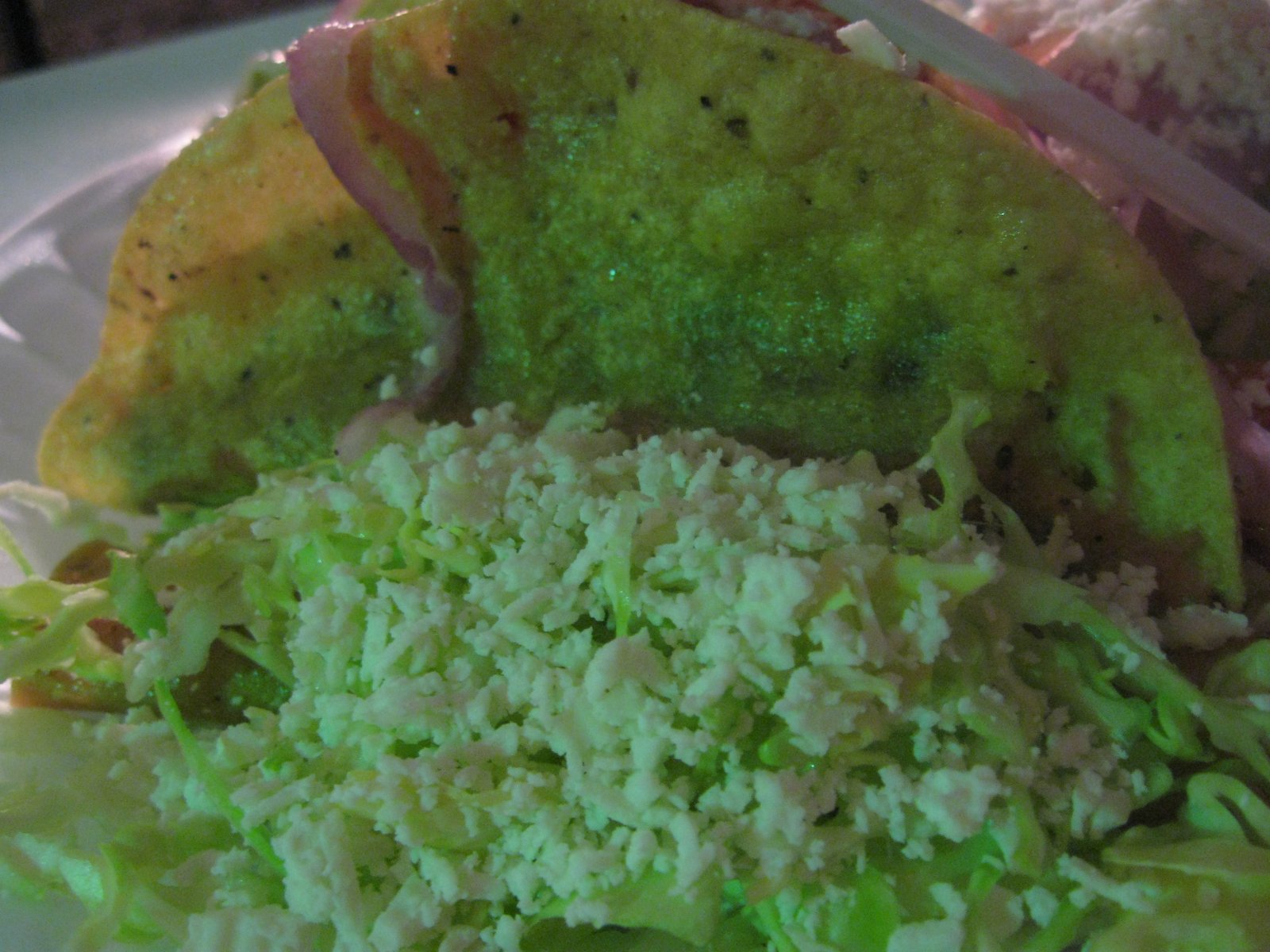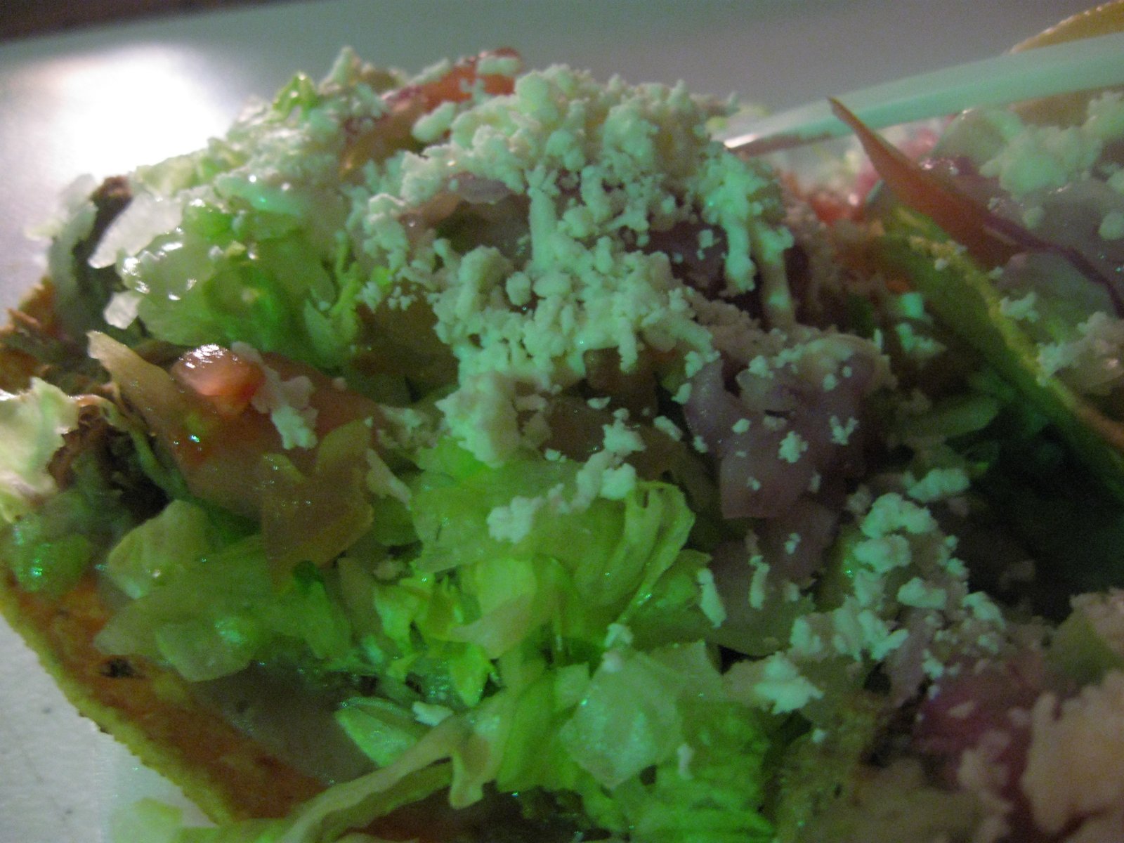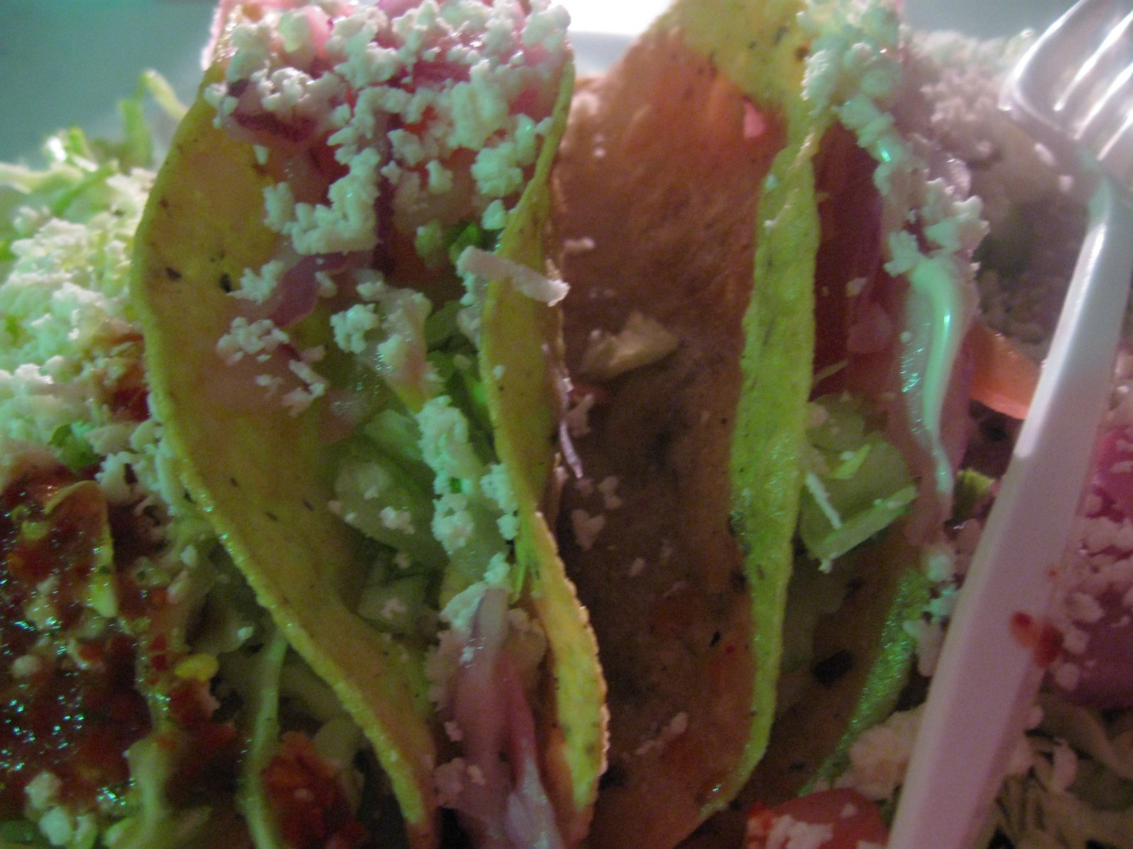 Then we received our order. The lighting, as you can tell, is far from ideal for photographs, but here is a picture of a couple of the excellent crunchy tacos:
