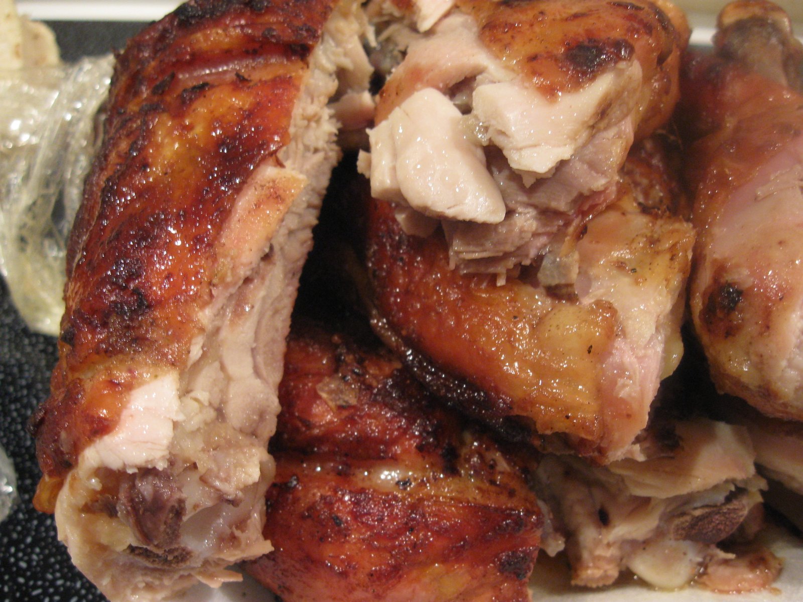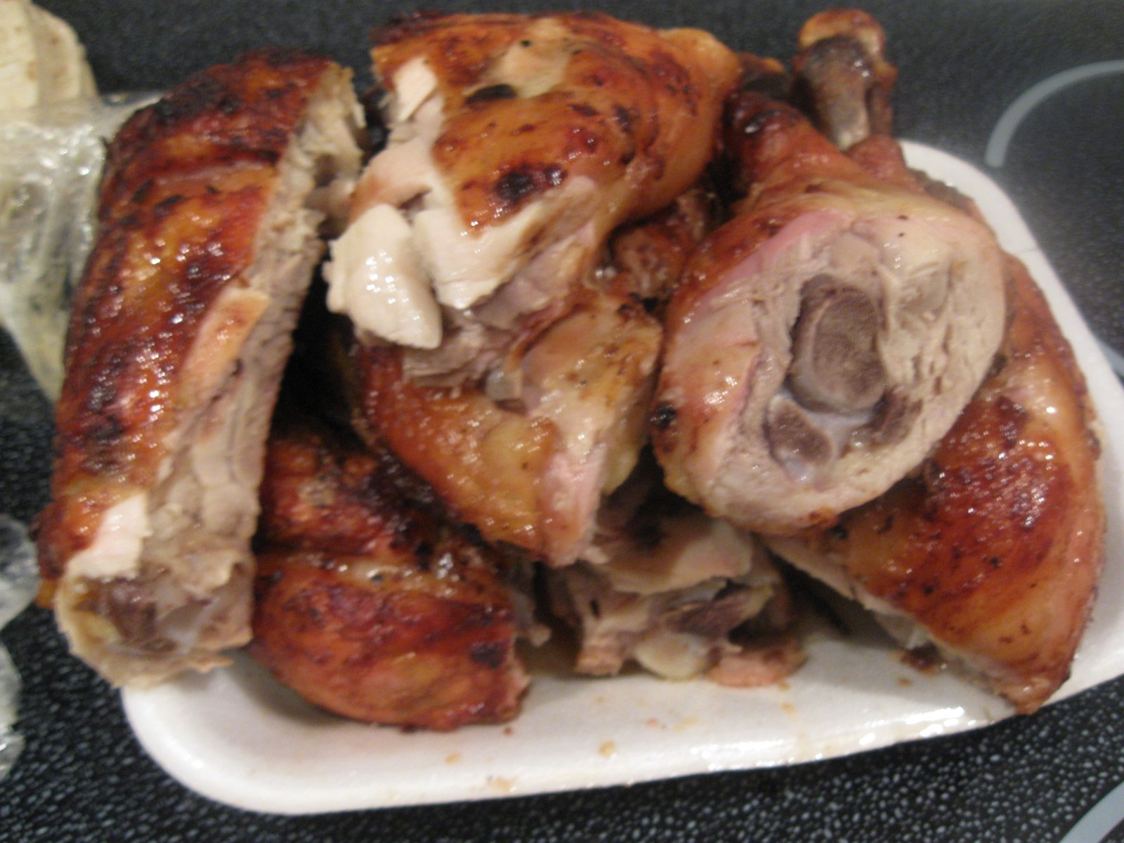 These are special chickens that have four legs, four thighs, but no breast or wing. That anatomical peculiarity puzzled me the first time I ordered a whole chicken ($9). Must be a damn strange looking bird when alive, but it looks pretty good when served: