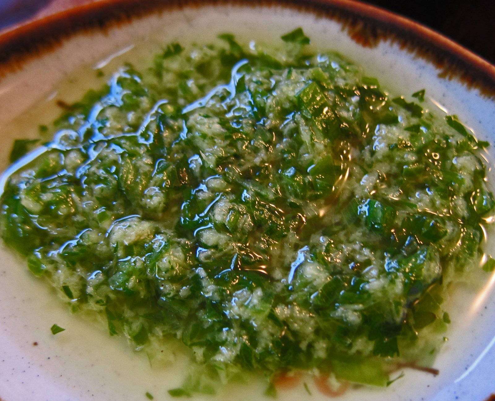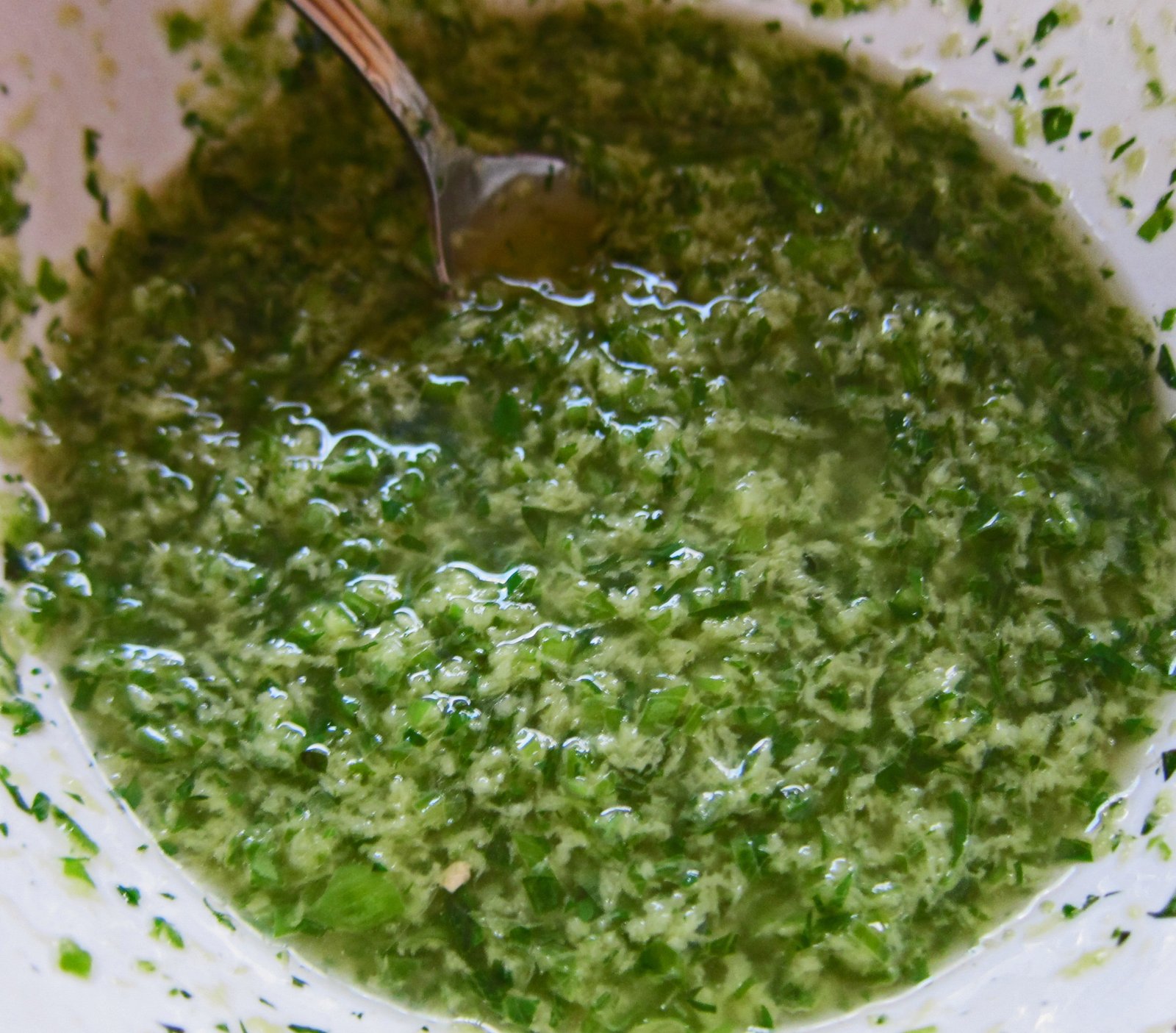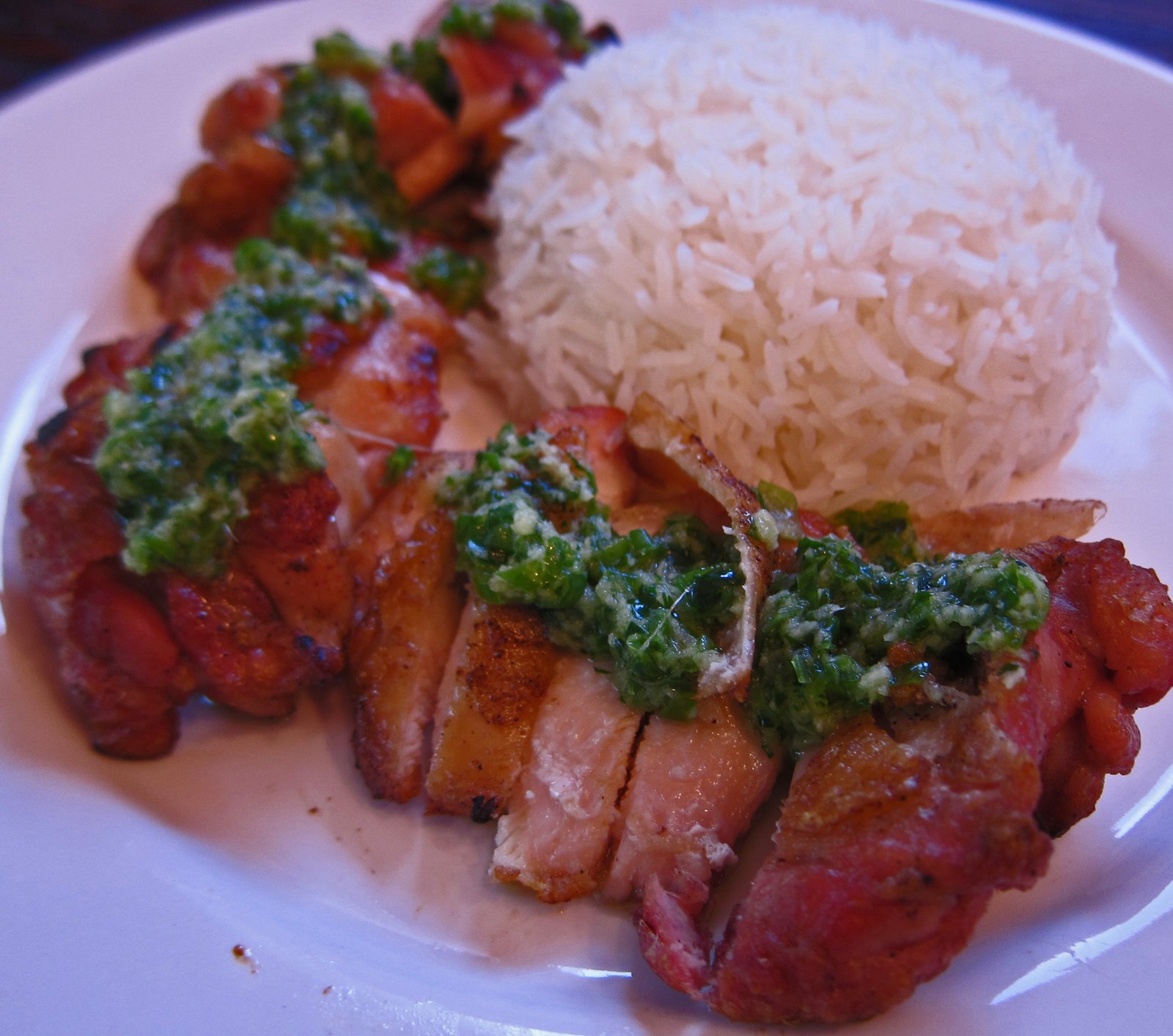 I didn't even use the food processor. I grated the garlic and ginger, mixed in the scallion and cilantro, added the hot (not smoking) peanut oil. By that time the coals were hot, I poured the coals out, arranged them in the typical two level grilling thingy, placed the grate on the grill to heat. Came back in….by this time the oil had cooled enough to taste…I then added sea salt and white pepper to taste…..with the understanding that the flavors will become stronger over time. I put the entire thing in the the fridge to cool (actually in the freezer for a couple of minutes, then the fridge). You could do the whole sauce thing the day before…..