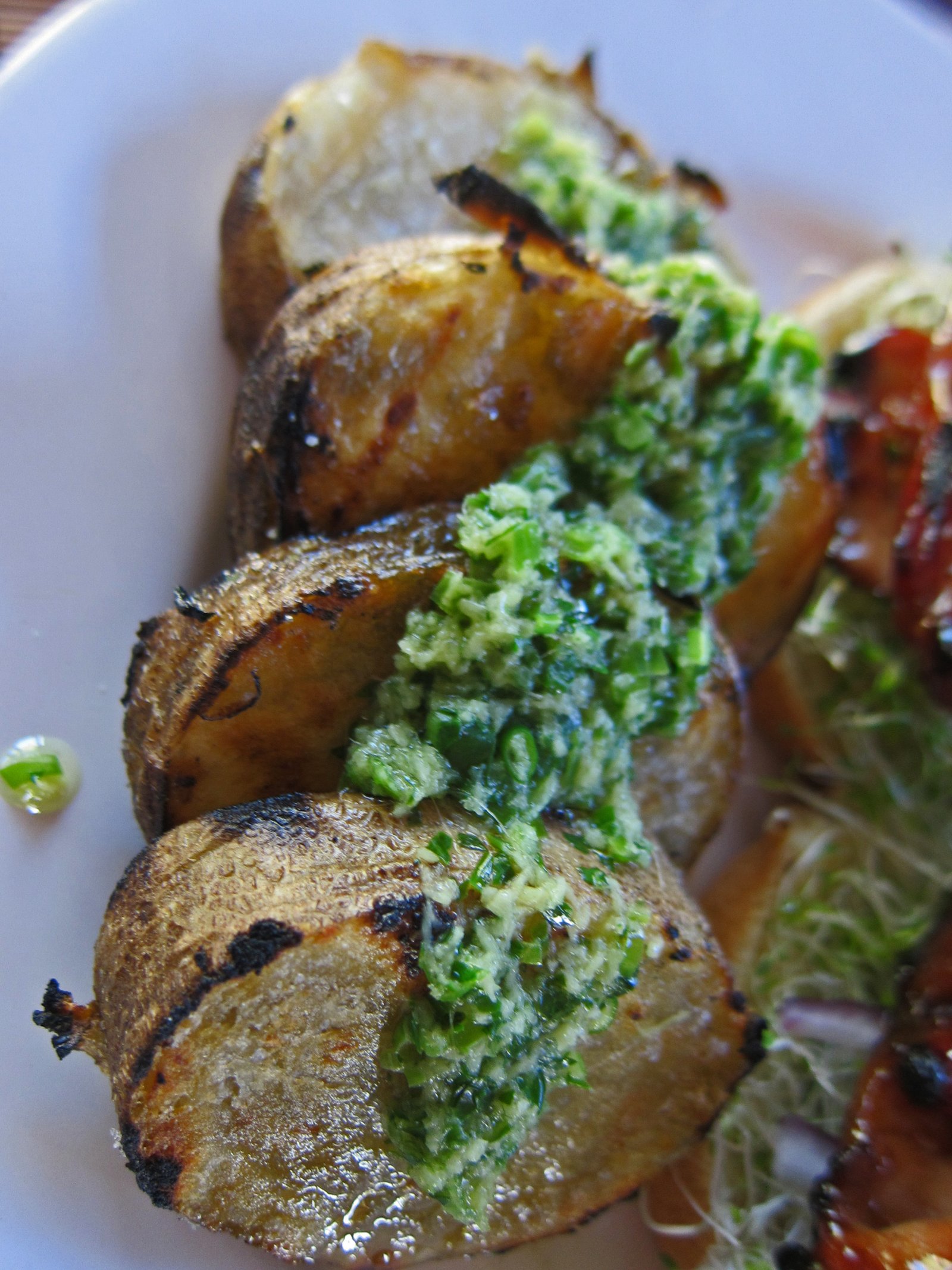 So what does this have to do with the cold ginger chicken sauce? Well, the Missus loves the sauce on rice…. but geeez, rice and a sandwich? Maybe for FOY (friend of yoso) "AZ", but I can't do it. So I grilled some potato slices…..real easy…microwave first, slice, brush with canola oil, salt, and grill. The potatoes are already cooked, and pretty darn hot (be careful handling), so grilling will create a nice crust. And dipped into some of this sauce………. 'nuff said. It had the Missus seal of approval.
