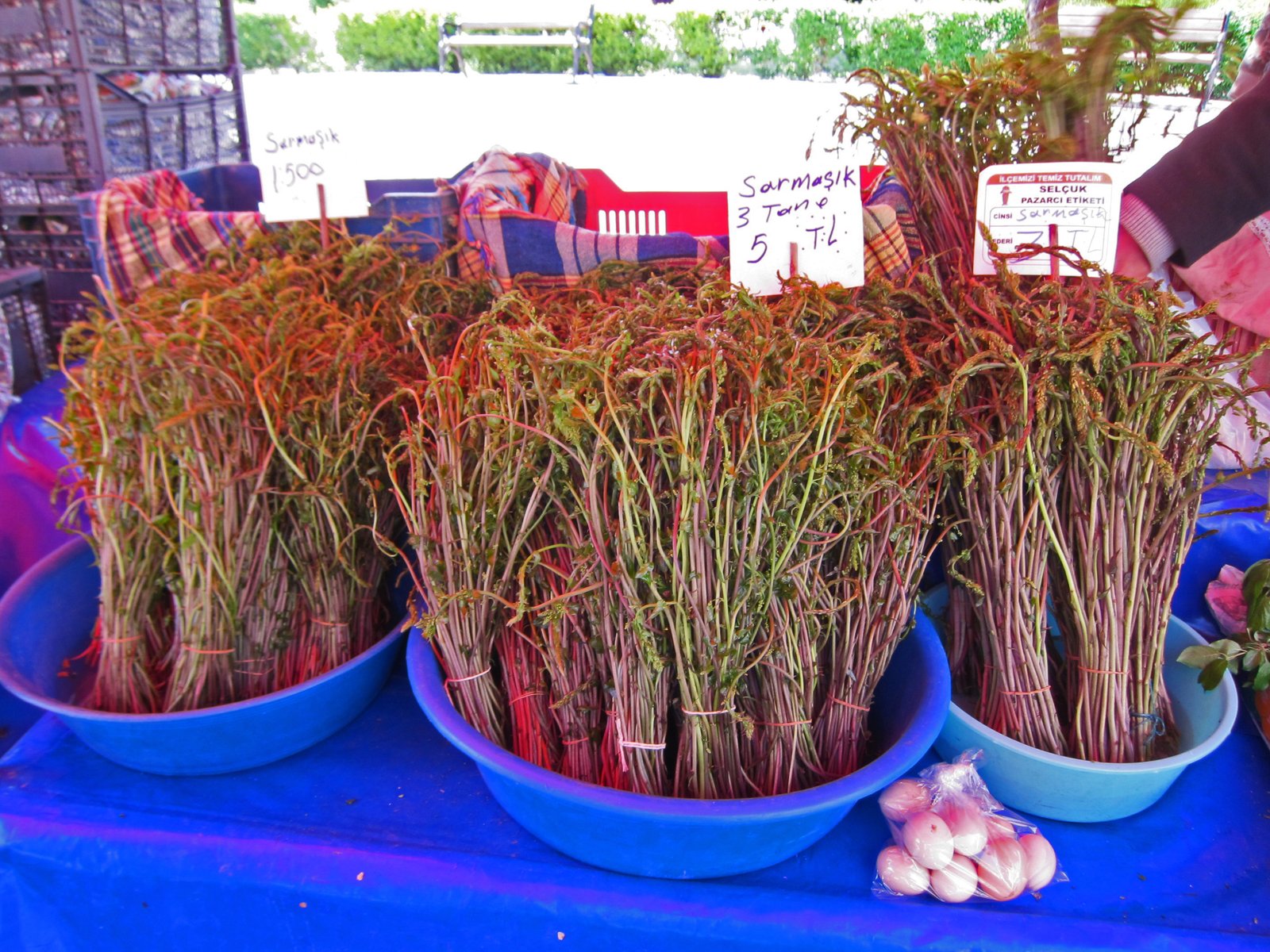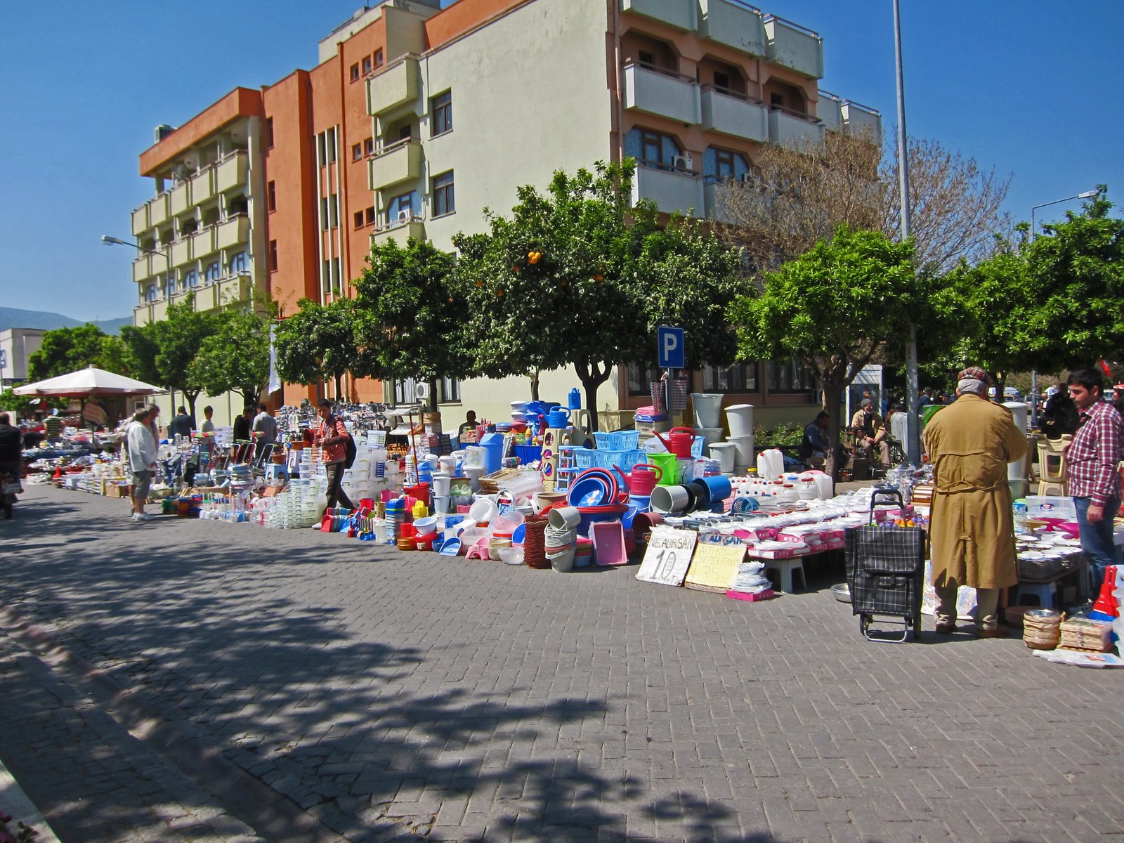 We returned from Ephesus hot and tired. A quick shower revived us and we decided to grab some lunch. We'd heard that there's a large market held behind the bus station…. and this being Selcuk, nothing is very far away. We decided to do some "self-catering" and check out the market. We were both quite surprised at the size of the market…. starting from the household goods sold on the streets approaching the market…..